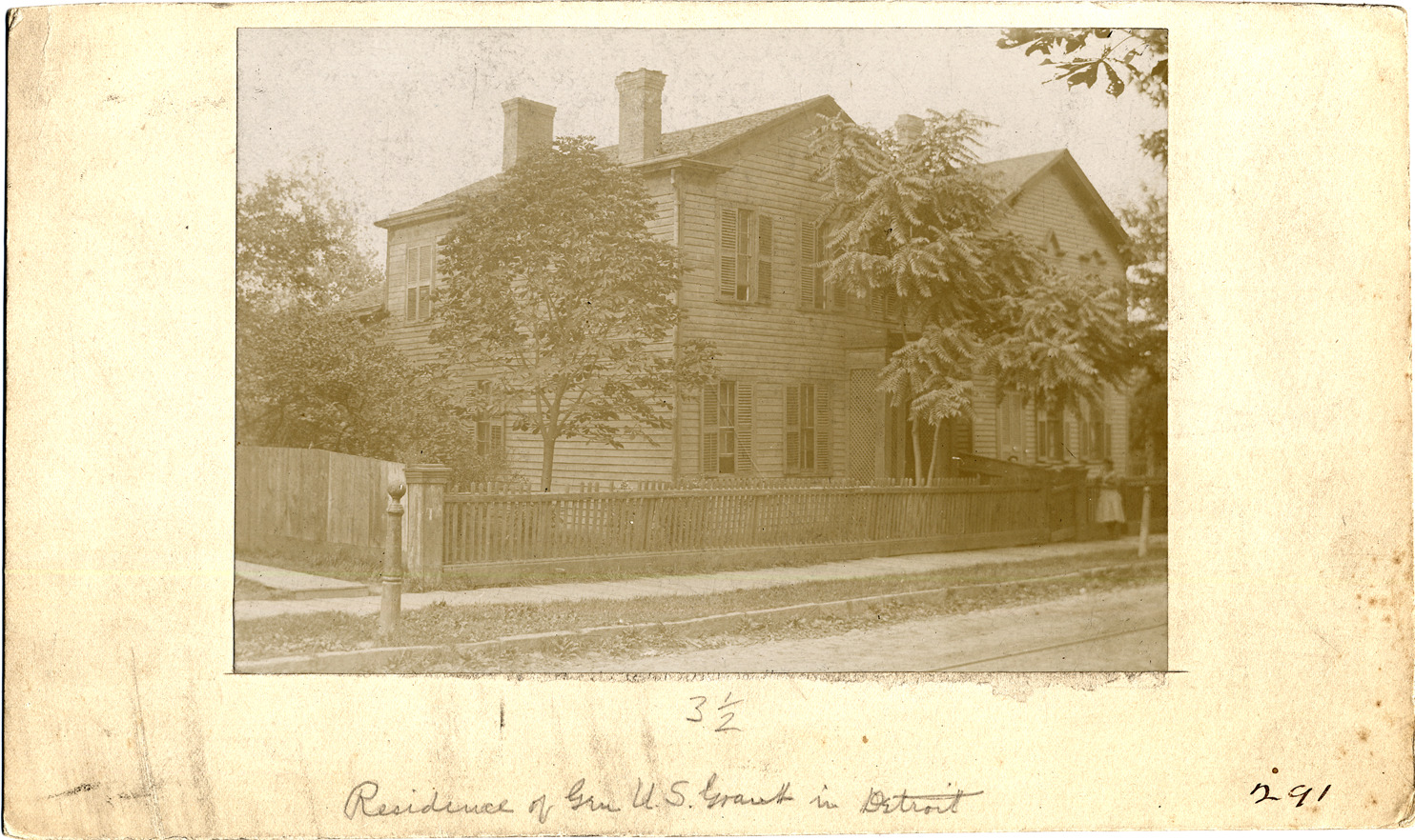 Favorite this☆ Ulysses S. Grant house Description: Clapboard house behind picket fence, viewed at an angle from street. Trees in front of house and other houses visible. Handwritten on mat front: "Residence of Gen. U.S. Grant in Detroit." Handwritten on mat back: "253 Fort St. E." Details Resource ID: DPA2689 Subject: Wooden-frame houses--Michigan--Detroit Historic buildings--Michigan--Detroit Grant, Ulysses S. (Ulysses Simpson), 1822-1885--Homes and haunts--Michigan--Detroit Albumen prints Photographic prints Date Issued: Unknown year Format: 1 photographic print mounted on mat board ; image 4.5 x 6.5 in. Member of: Burton Historical Collection Filing Location: D/Historic houses-Grant, Ulysses S. Note (Content): From Charles L. Clark Estate Rights: Physical rights are retained by DPL. Copyright is retained in accordance with U.S. copyright laws.