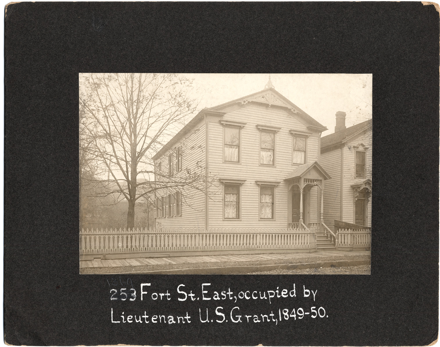 Clapboard house behind picket fence, viewed at an angle from street. Trees in front of house and other houses visible. Handwritten on mat front: "253 Fort St. East, occupied by Lieutenant U.S. Grant, 1849-50." Printed on mat back: "J.T. Kerr, photographer, Howlett P.O., Wayne Co., Mich., phone: Grand 18-3r."