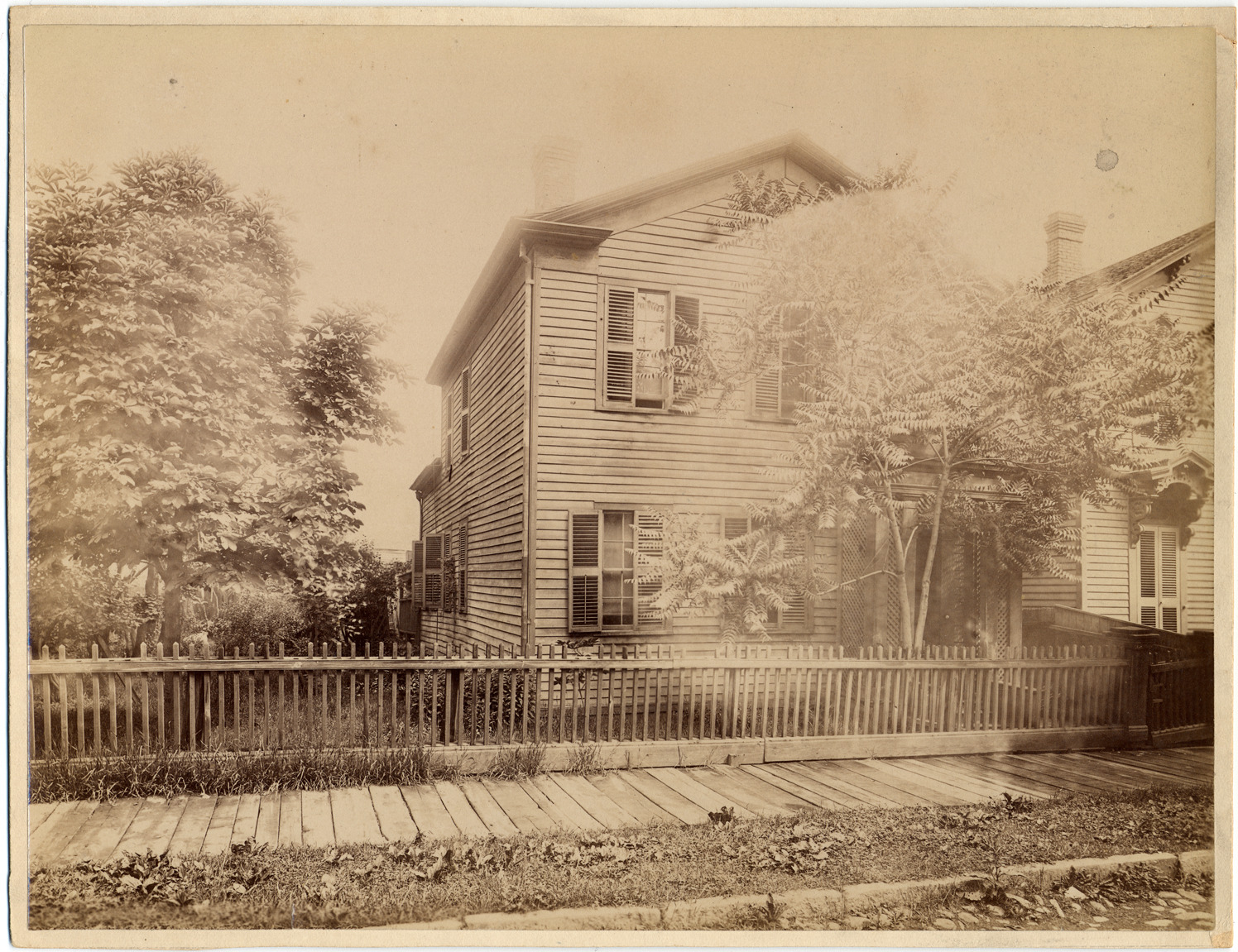 Clapboard house viewed at an angle from street over picket fence and wooden sidewalk, with another house beyond. Trees in yard. Stamped on mat back: "From Alvord & Co., exclusively commercial photographers, 55 Rowland St., Detroit, Mich., ground floor." Handwritten on card back: "Jefferson Ave. & Russel St." Faded spots in photograph.
