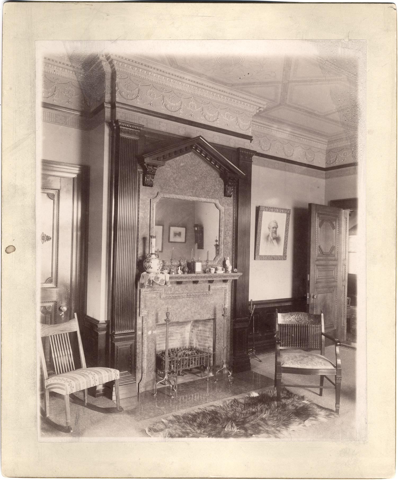 Fireplace with stone surround and carved wooden mantelpiece with mirror in sitting room. Basket grate; fur rug and upholstered chairs by fireplace; portrait hanging by door to hall. Stamped on mat back: "The Allgeier Co., photos, Chicago."