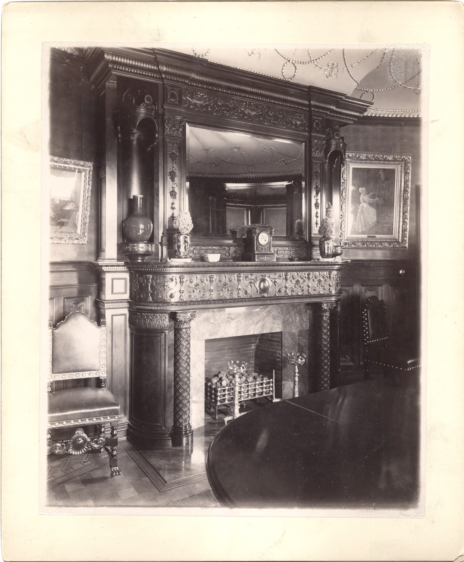 Fireplace with marble surround and columned, carved wooden mantelpiece with mirror in dining room. Basket grate; plaster relief-work in cove moulding; paintings on wood-paneled walls. Polished dining table in foreground; objets d'art on mantel. Stamped on mat back: "The Allgeier Co., photos, Chicago."