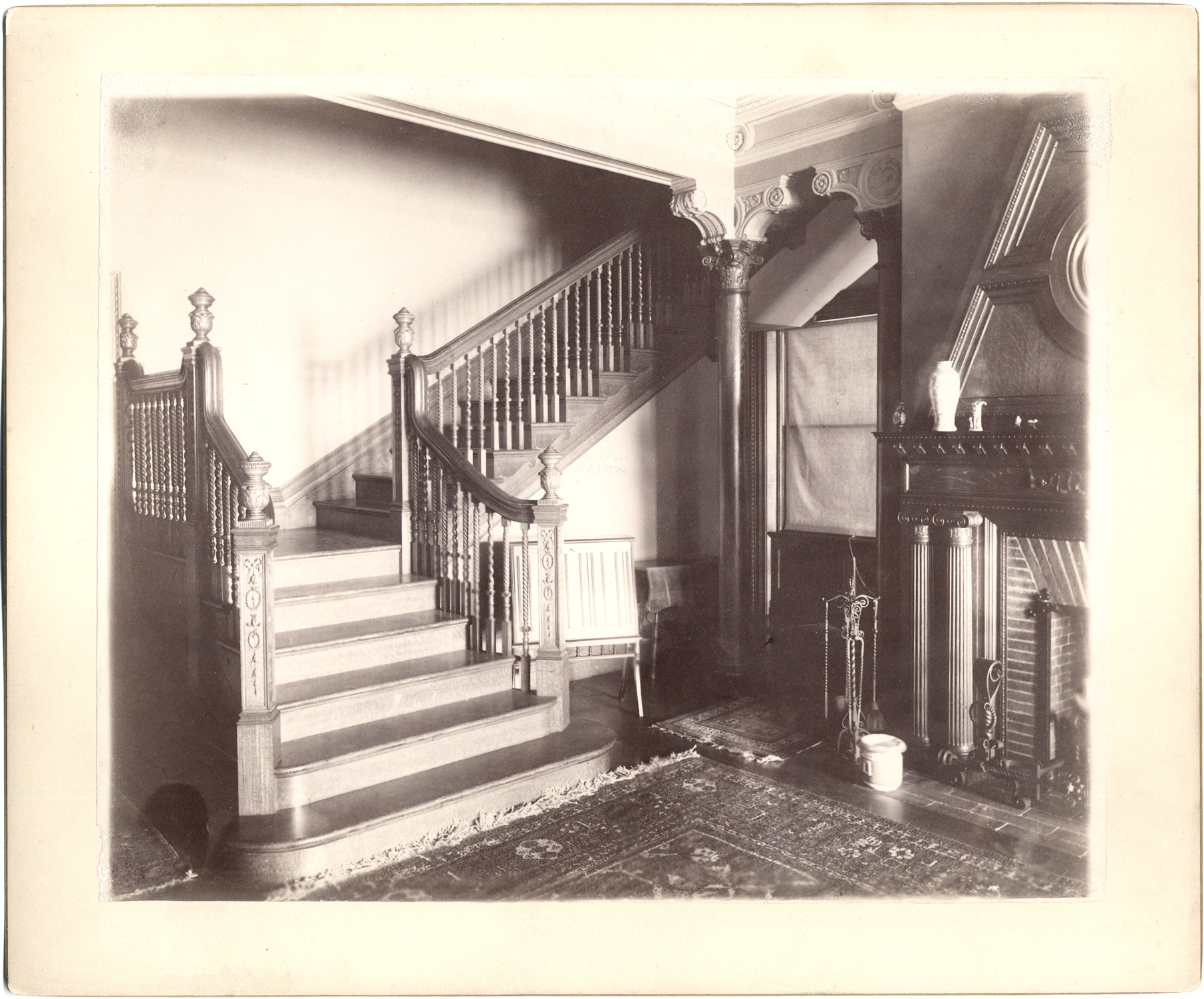 View from floor by wooden staircase with spiral balusters; decorative newel posts at corners. Columns support upper landing of staircase; wooden floor with oriental carpets; fireplace partially visible. Stamped on mat back: "The Allgeier Co., photos, Chicago."