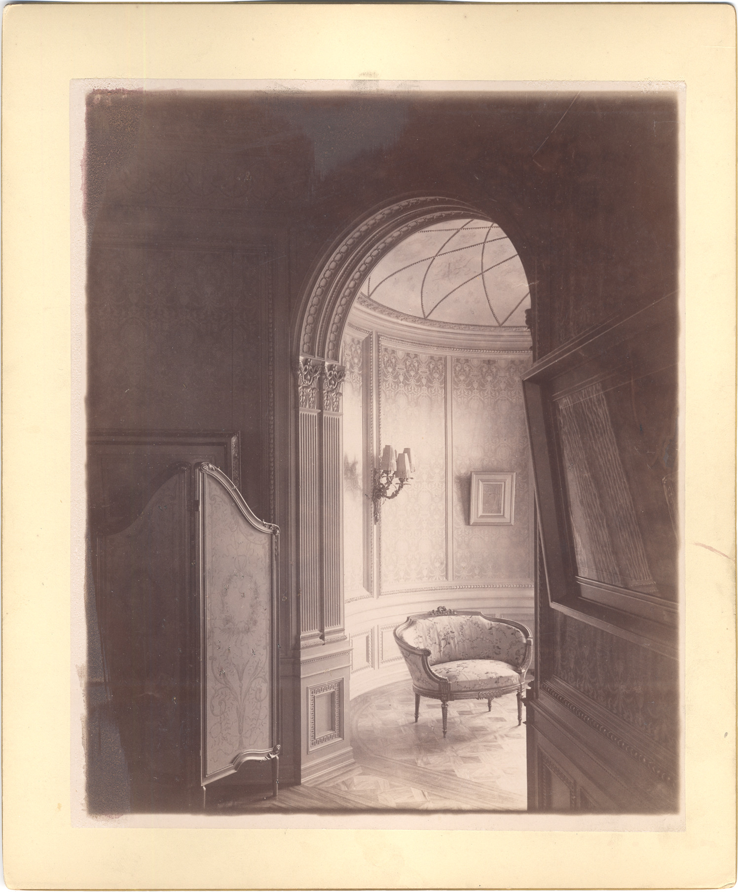 Favorite this☆ Tower room in Col. Frank J. Hecker residence Description: View from darkened room through arch into sitting room, with curving walls and ceiling. Upholstered chair in center; electric lamps and pictures on wall; folding screen by arch. Stamped on mat back: "The Allgeier Co., photos, Chicago." Details Resource ID: DPA2741 Creator: Allgeier Co. Subject: Hecker, Frank J. (Frank Joseph), 1846-1927--Homes and haunts--Michigan--Detroit Living rooms--Michigan--Detroit Living room furniture--Michigan--Detroit Photographers--Illinois--Chicago Albumen prints Photographic prints Date Issued: Unknown year Format: 1 photographic print mounted on mat board ; image 10.25 x 8.5 in. Member of: Burton Historical Collection Filing Location: D/Historic houses-Hecker, Col. Frank J. Rights: Physical rights are retained by DPL. Copyright is retained in accordance with U.S. copyright laws.