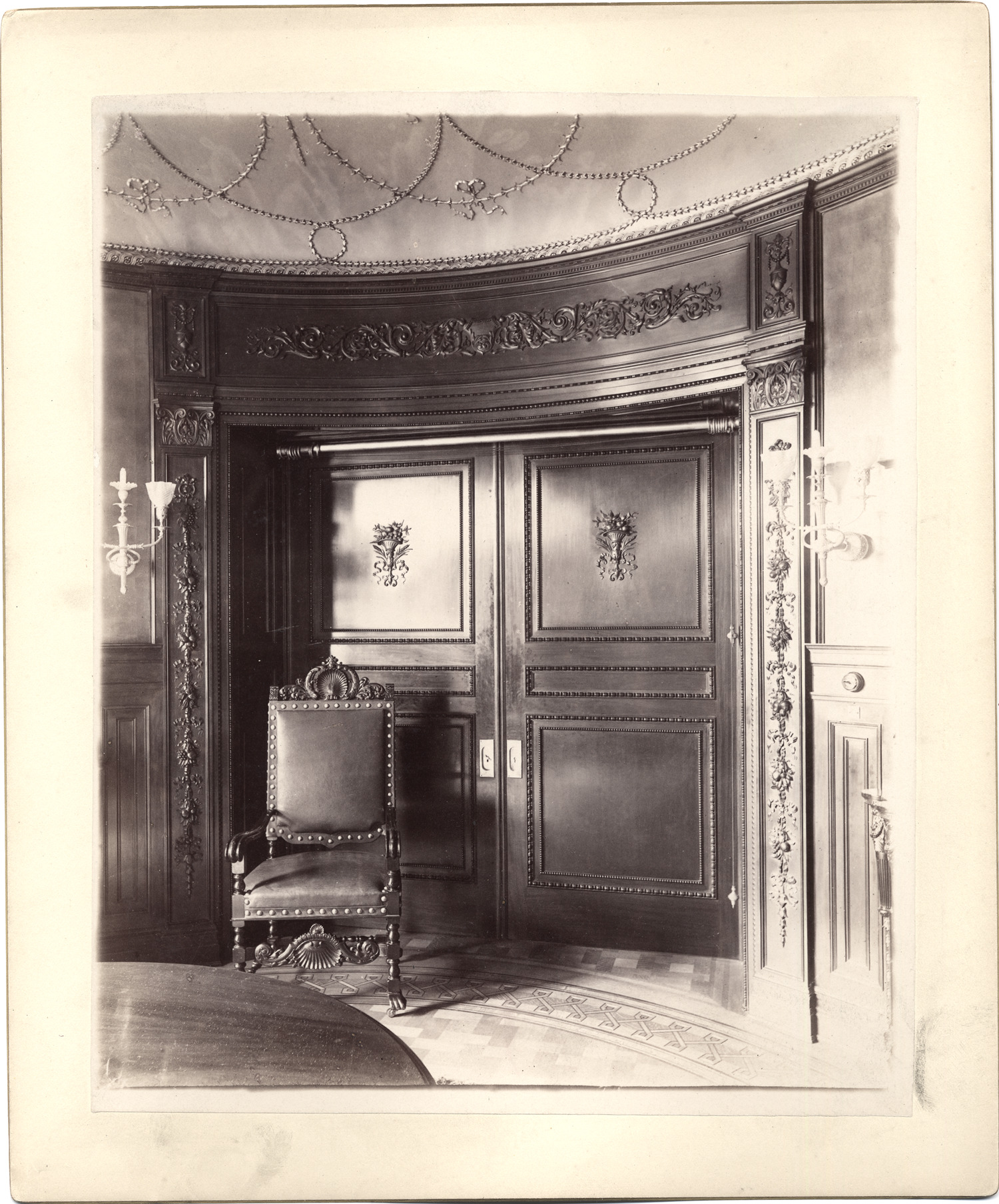 View of closed double pocket doors, paneled and carved. Set in carved wooden doorway with curved ceiling decorated with plasterwork. Wood paneled wainscoting; electric lamps on walls; leather upholstered chair by door; dining table in foreground. Stamped on mat back: "The Allgeier Co., photos, Chicago."