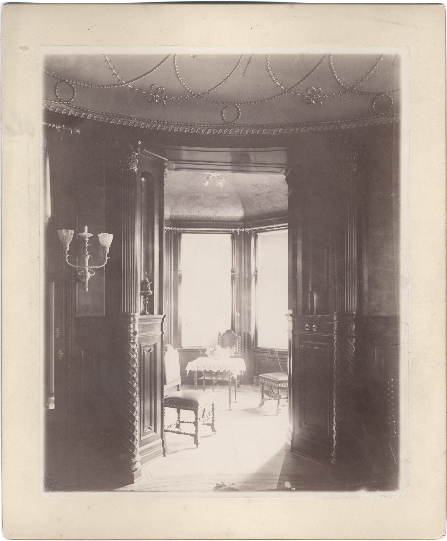 View from dark room into sunlit tower room with window on each wall. Room has wood wainscoting, bas relief curved ceiling, electric lamp on wall, columns by doorway. Tower room has curved ceiling with electric lamp in center. Stamped on mat back: "The Allgeier Co., photos, Chicago."