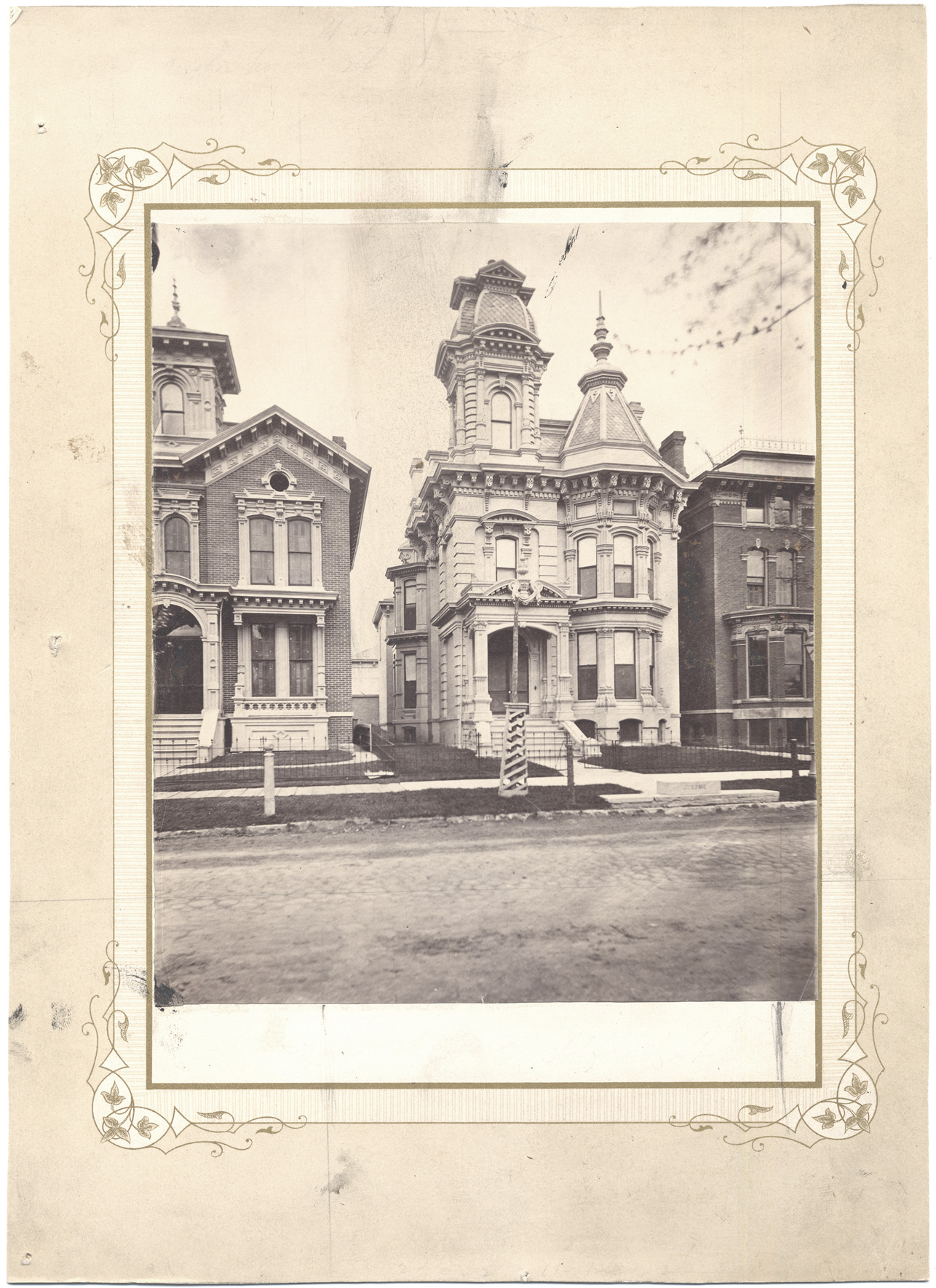 Favorite this☆ George Jerome residence Description: House in Eastlake Victorian style, ornate brickwork, square tower and spire. Cobblestone street in foreground and similar houses on either side. Residence of George Jerome. Handwritten on back: "Geo. Jerome, 85 Alfred St., 1881." Details Resource ID: DPA2771 Subject: Brick houses--Michigan--Detroit Architecture, Queen Anne--Michigan--Detroit Albumen prints Photographic prints Date Issued: 1881 Format: 1 photographic print mounted on mat board ; image 7.25 x 6 in. Member of: Burton Historical Collection Filing Location: D/Historic houses-Jerome, George Rights: Physical rights are retained by DPL. Copyright is retained in accordance with U.S. copyright laws.
