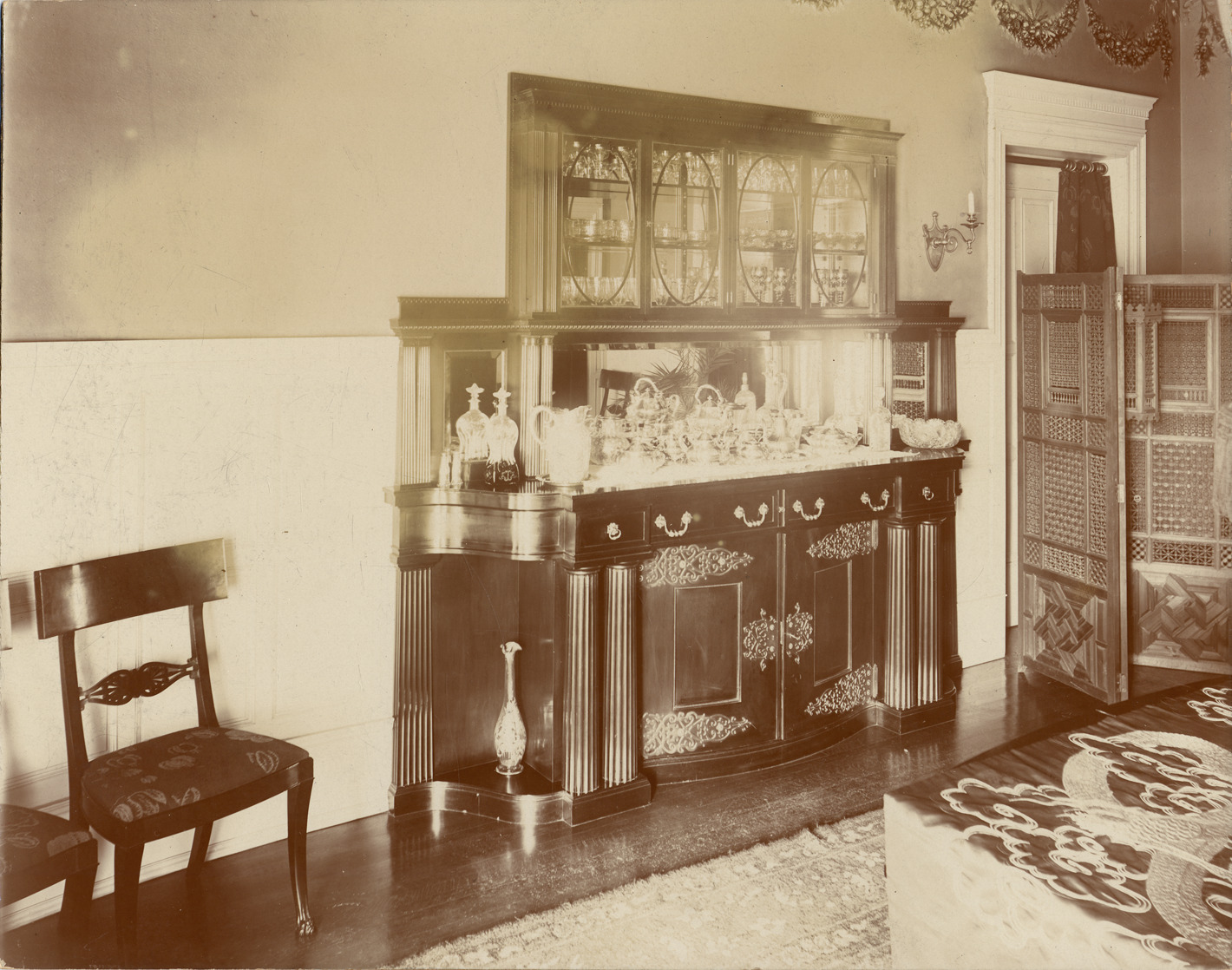 Favorite this☆ Interior of Henry Bourne Joy residence Description: Living room of Henry Bourne Joy house, located on 501 East Jefferson. Focus on ornate china cabinet, top covered with glass bowls and fine china. Glass case above stores variety of glassware. Handwritten on back: "501 East Jefferson, Detroit." Details Resource ID: DPA2775 Subject: Living rooms--Michigan--Detroit Furniture, Victorian--Michigan--Detroit Joy, Henry B. (Henry Bourne), 1864-1936--Homes and haunts--Michigan--Detroit Albumen prints Photographic prints Date Issued: Unknown year Format: 1 photographic print mounted on mat board ; image 7.5 x 9.5 in. Member of: Burton Historical Collection Filing Location: D/Historic houses-Joy, Henry Bourne Rights: Physical rights are retained by DPL. Copyright is retained in accordance with U.S. copyright laws.