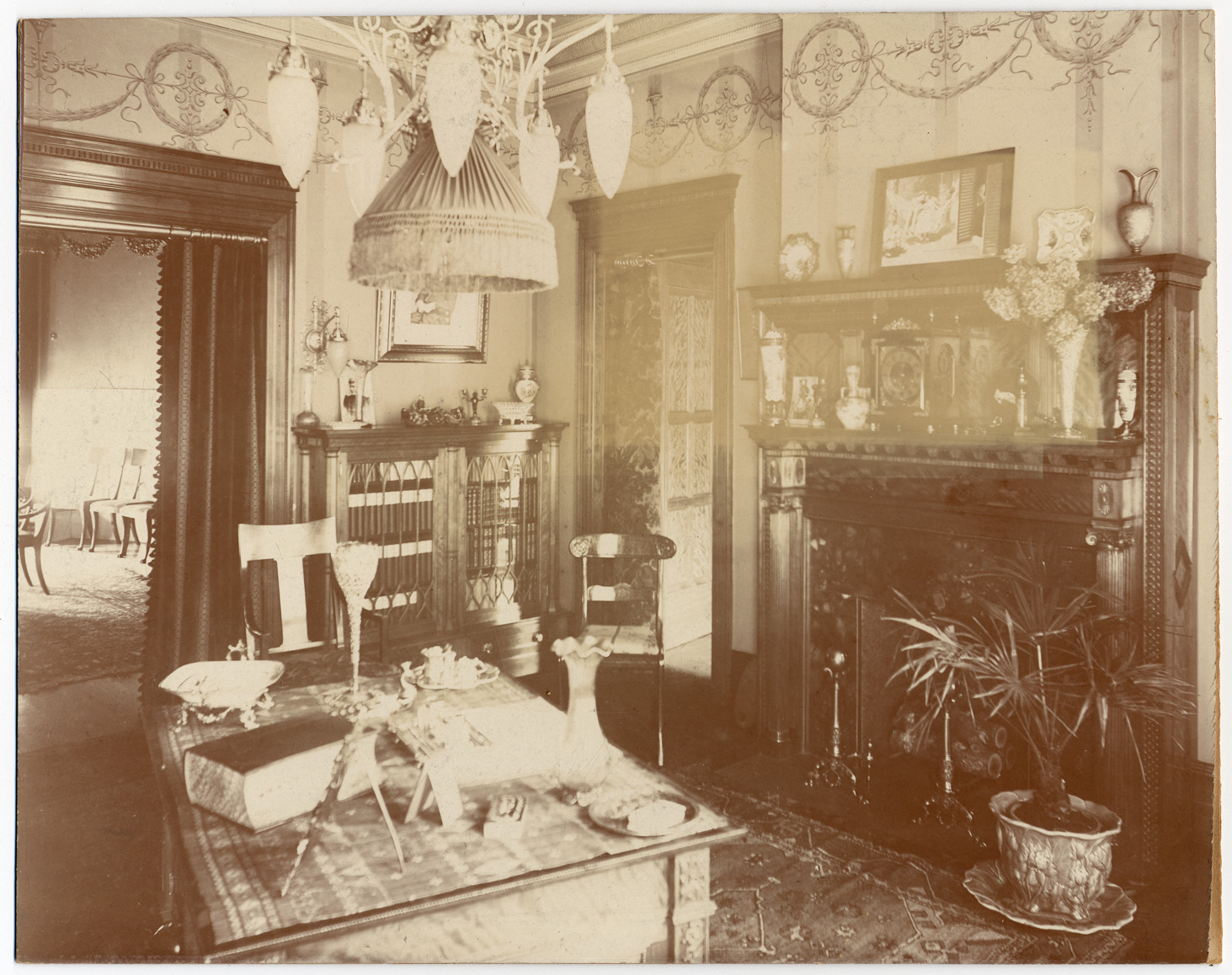 Living room of Henry Bourne Joy house, located on 501 East Jefferson. Fireplace on right-hand side of photo, mantel lined with small pictures, flowers, and vases. Chandelier with fringed lamp, table in foreground, bookcase in background and doorways to other rooms. Handwritten on back: "501 East Jefferson."