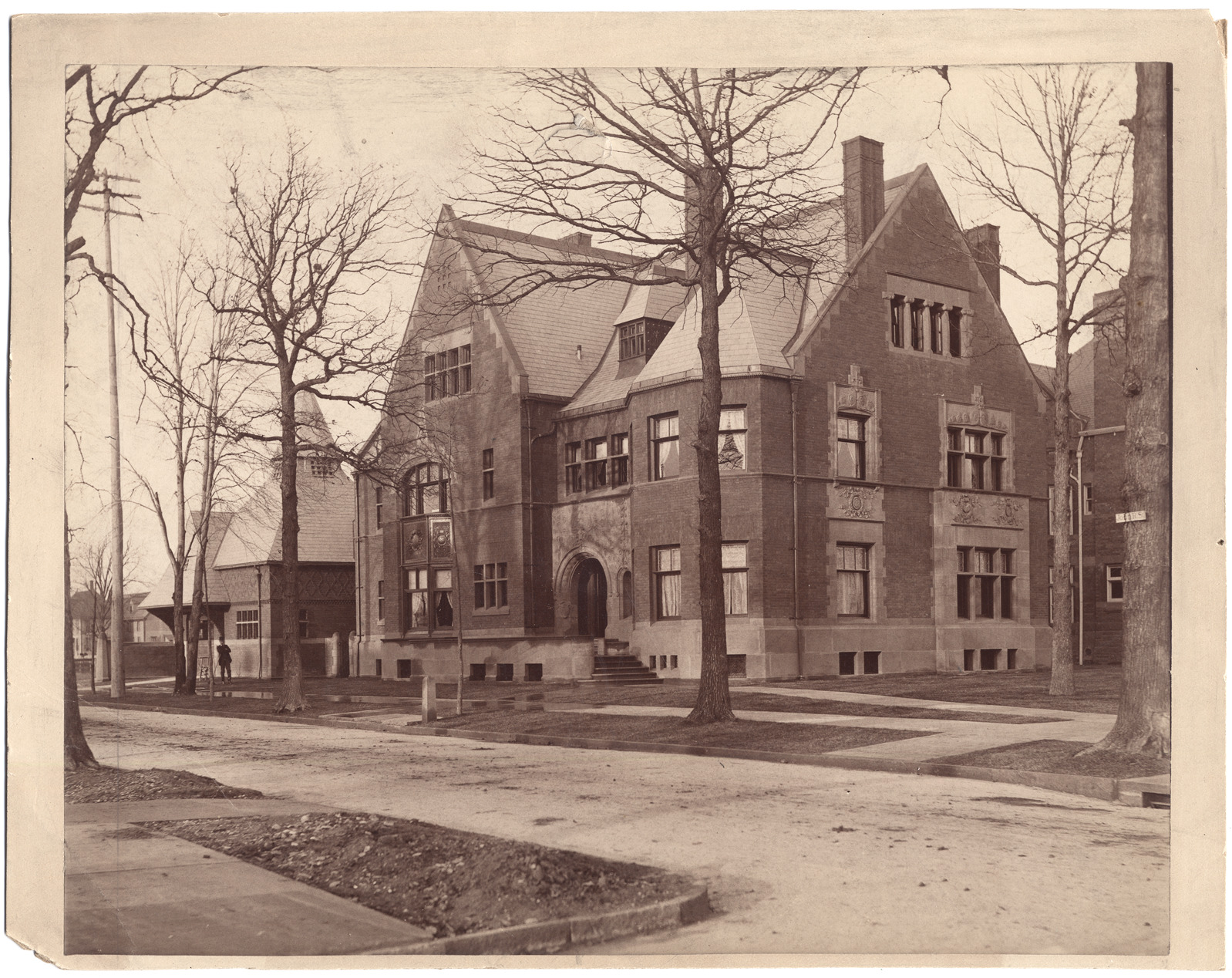 Three-story brick house, with light brickwork around windows. Rounded entranceway. Paved street in foreground. Residence of Gilbert W. Lee. Handwritten on back: "N.E. cor. Ferry & John R, 1889." Stamped on back: "Alvord & Co., 55 Rowland St., Detroit, Mich."