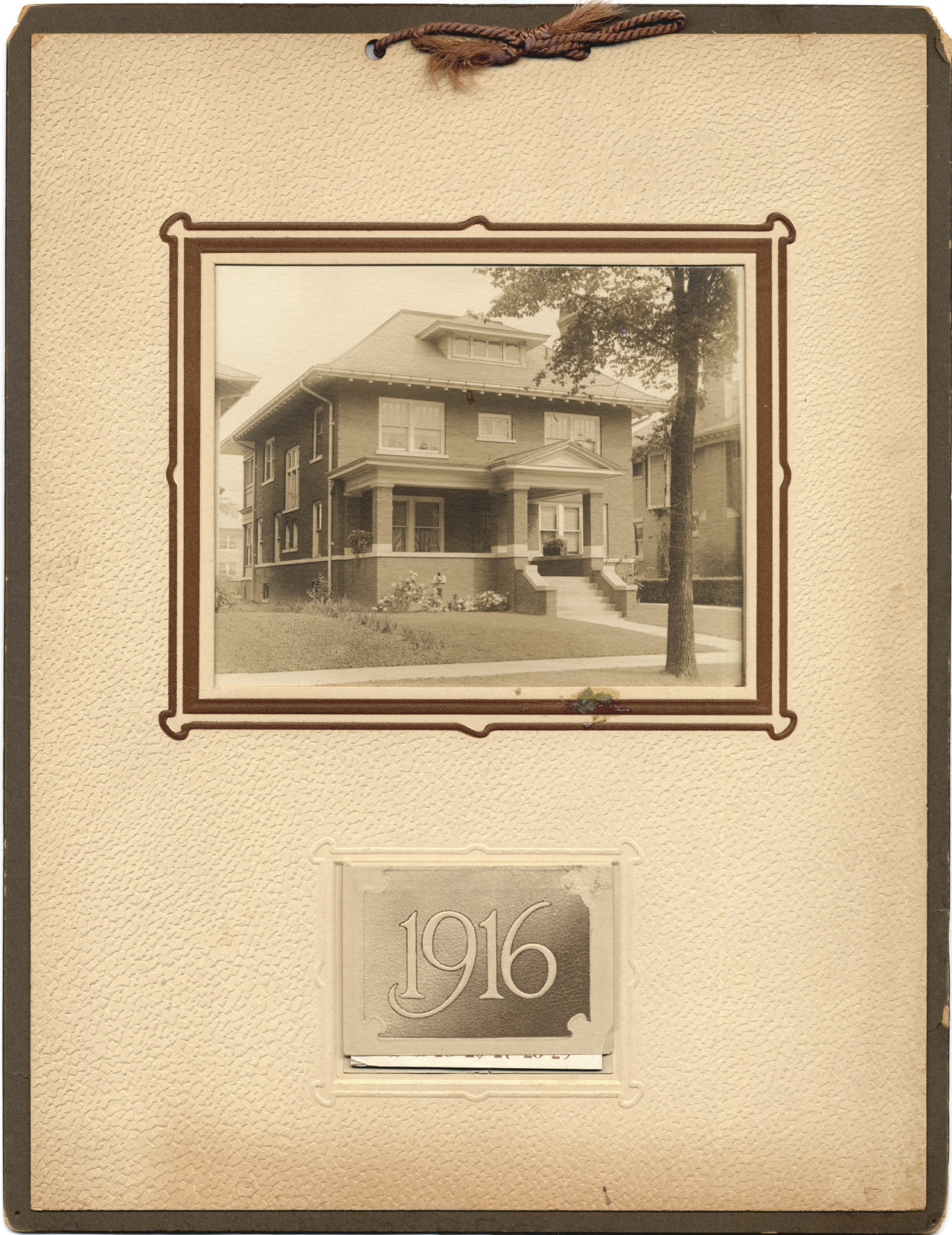Small brick house, with large front porch and small garden in front. Photo is set in mat board with small 1916 calendar in front. Handwritten on back: "F.M. Lillibridge residence, built by grandfather Lillibridge, Ferry Ave., Detroit."