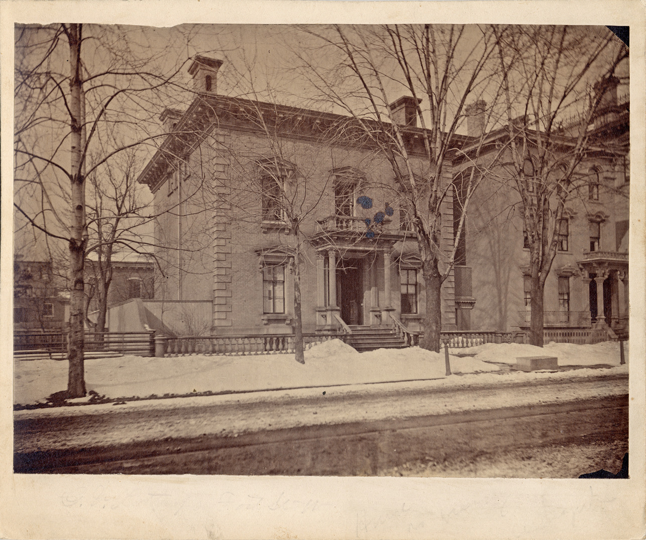 Two-story Colonial style brick house, pillared entranceway and four chimneys. Snow on ground, similar house on right side. Residence of George Van Ness Lothrop. Handwritten on back: "94 W. Fort Street, 1881, 1882."