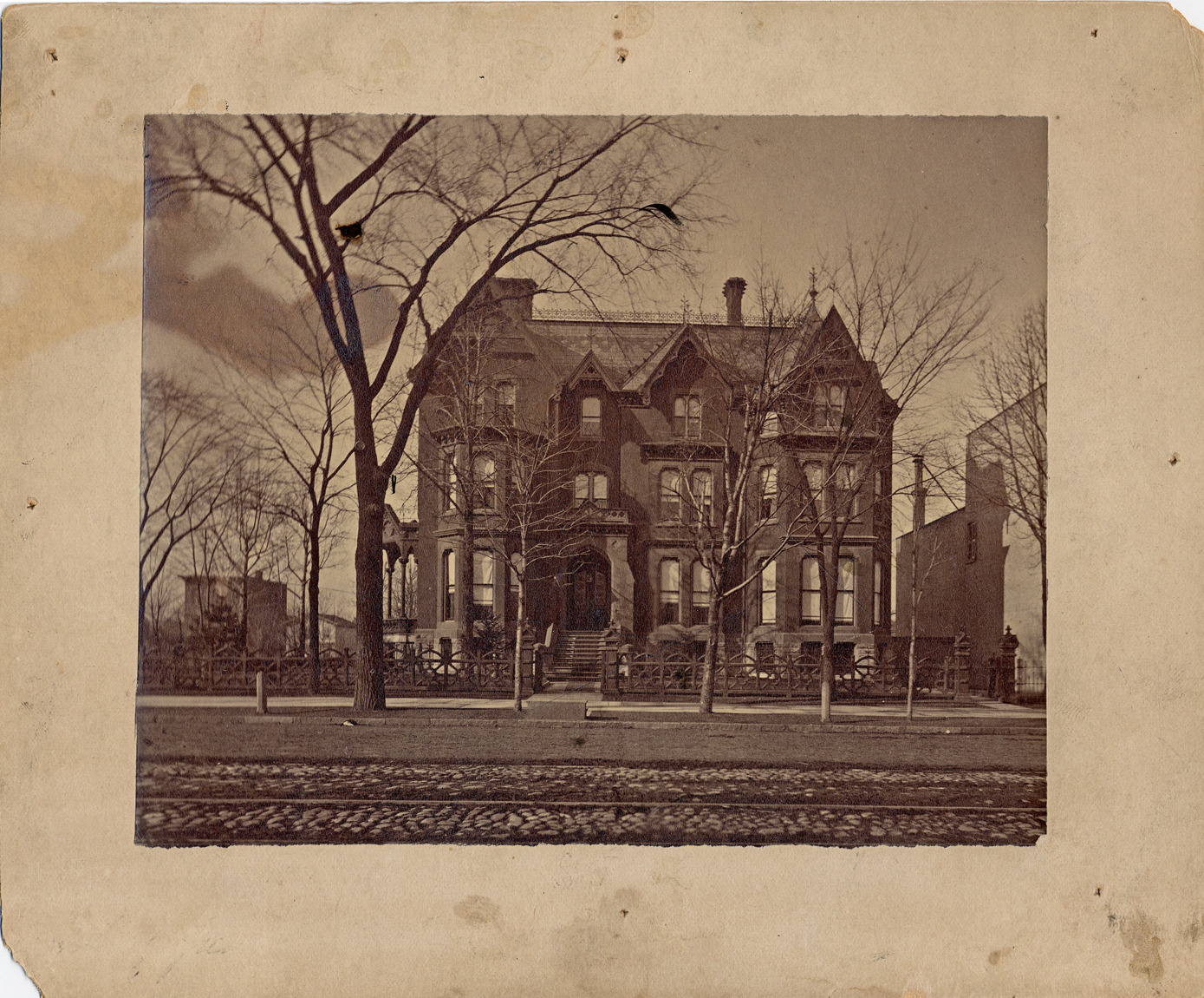 Front view of three-story brick Gothic style house, small side porch, multiple gables, decorative shingles on roof. Surrounded by heavy wrought iron fence, dirt road and trolley tracks in foreground. Residence of Senator James H. McMillan. Handwritten on back: "Jas. McMillan, Jefferson Ave., 1881."