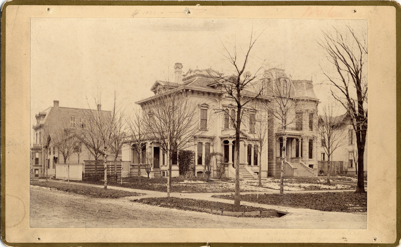 Front view of two-story clapboard house, mansard roof, small gabled dormer windows, small entry porch and larger side porch. Handwritten on back: "John Moore, 93 Washington Ave., 1881."