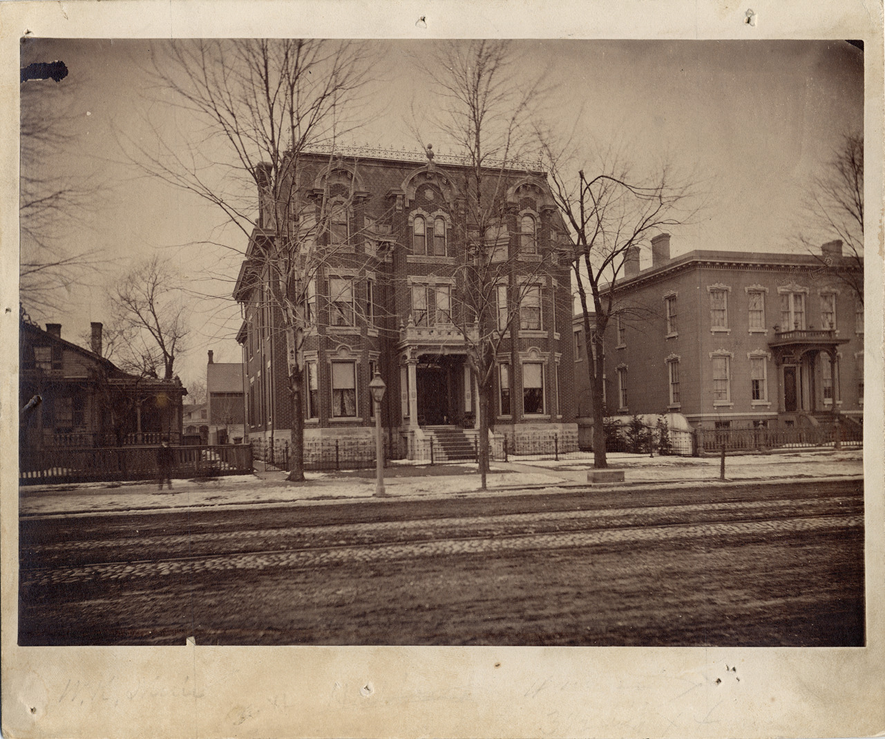 Large three-story brick house with mansard roof, decorative shingles and decorative brickwork around windows. Small entry porch; surrounded by wrought fence. Streetlamp and dirt road in foreground. Residence of William K. Muir. Handwritten on back: "635 Jefferson Ave., 1881."