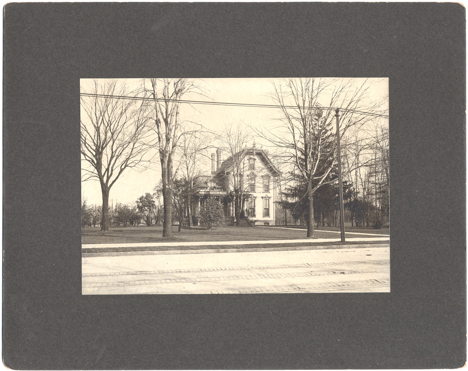 View of Robert J. Service residence; utility pole and lines in front. Handwritten on back: "'We lived there from 1899 to, I think, 1923.' Statement from H. F. Service, 2-1-41." Label on back: "1100 Woodward Ave., later 5336 Woodward Ave." Stamped on back: "Kerr, photographer, Howlett P.O., Wayne Co., Mich. phone: Grand 18-3r."