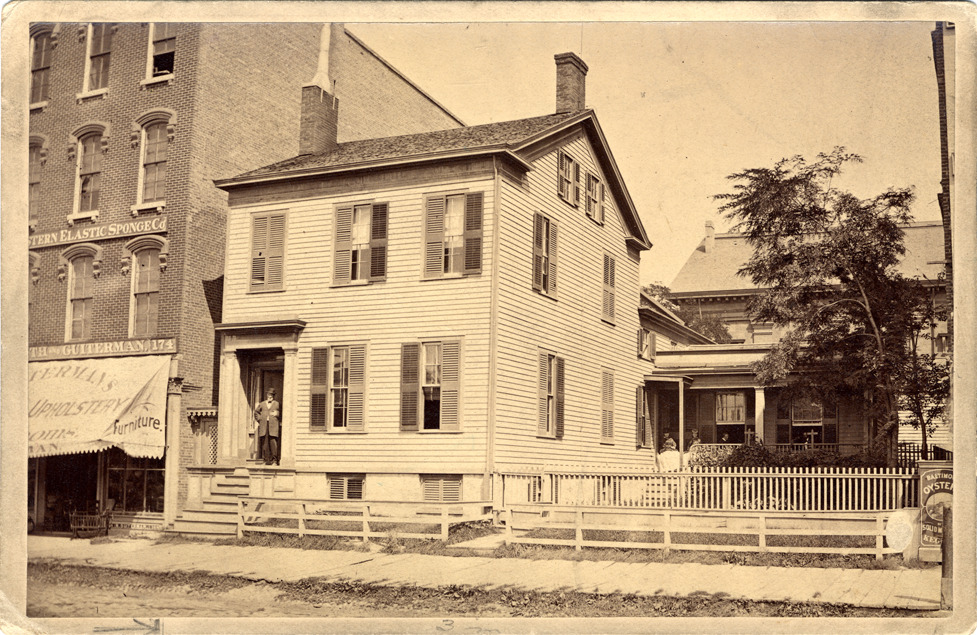 View of Alanson Sheley residence. Man wearing hat stands in doorway; two women seated on side porch. Next door to brick building; sign above window reads in part: "Elastic Sponge Co." and "Guiterman, 174." "Upholstery" and "Furniture" on awning of business. Handwritten on back: "Old Sheley house, east side Woodward Ave. just above Gratiot in 1867, 172 Woodward Ave."