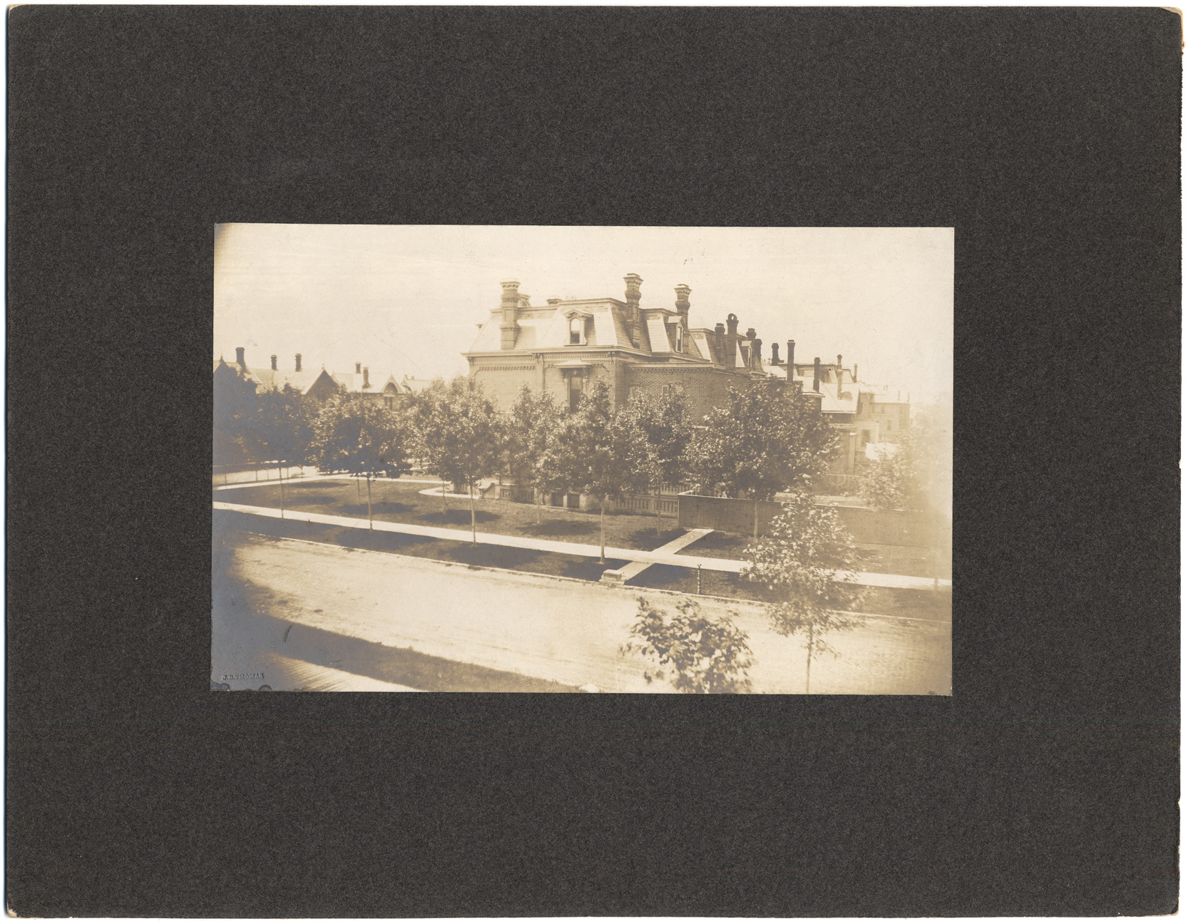 View of Thomas C. Starret residence; mansard roof. Stamped in lower left corner in front: "J. B. Thomas." Handwritten on back: "No.3. N.W. cor. Second and Canfield Ave. I think I took this neg. about 1883, possibly a little later. Second Ave. paved and stone sidewalks down. John."