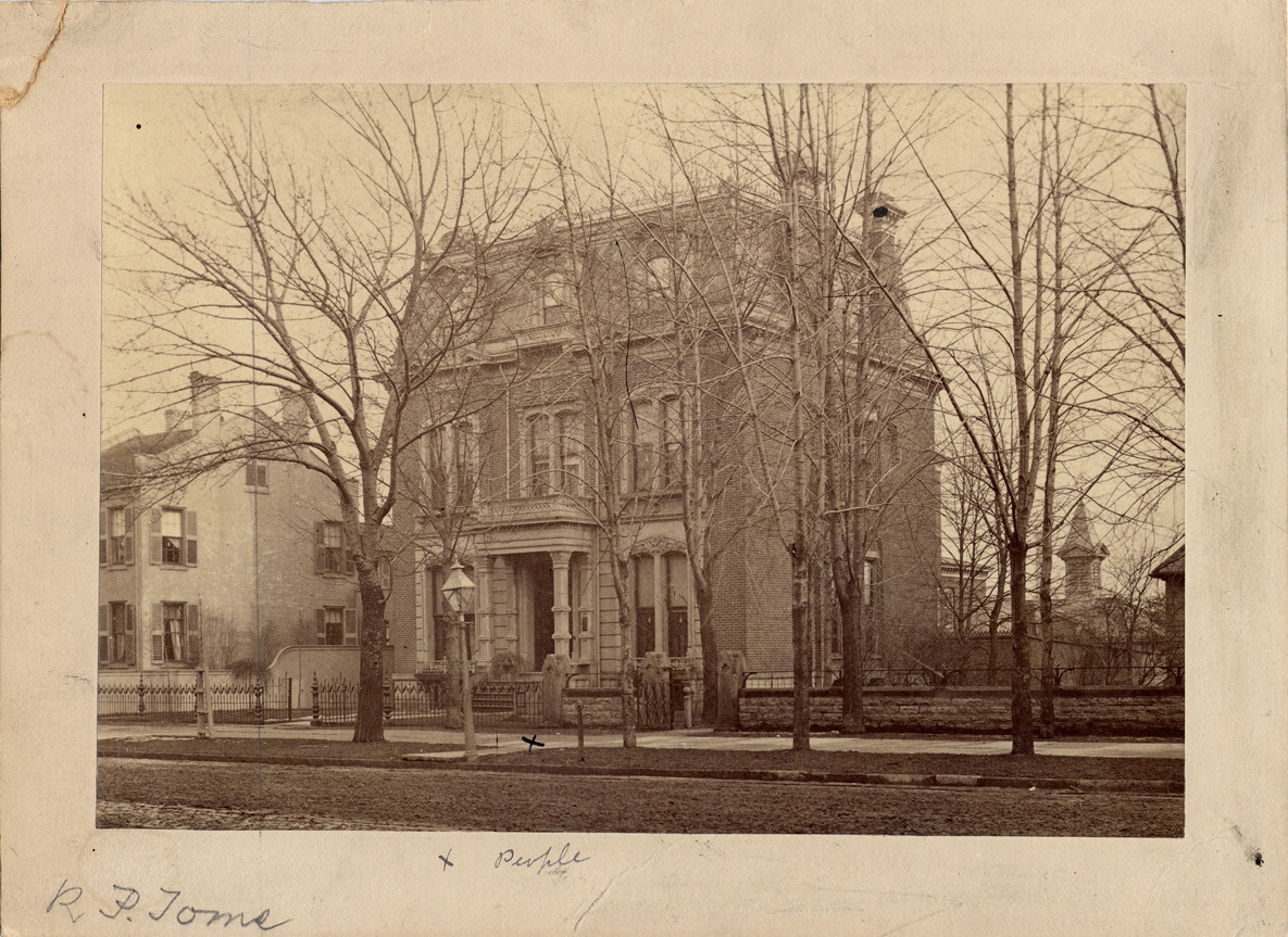 Second Empire brick house with mansard roof, viewed at an angle from street. Behind metal fence and leafless trees; lamppost; other buildings visible. Handwritten on mat back: "Robert P. Toms, 526 Jefferson Ave., 1881."