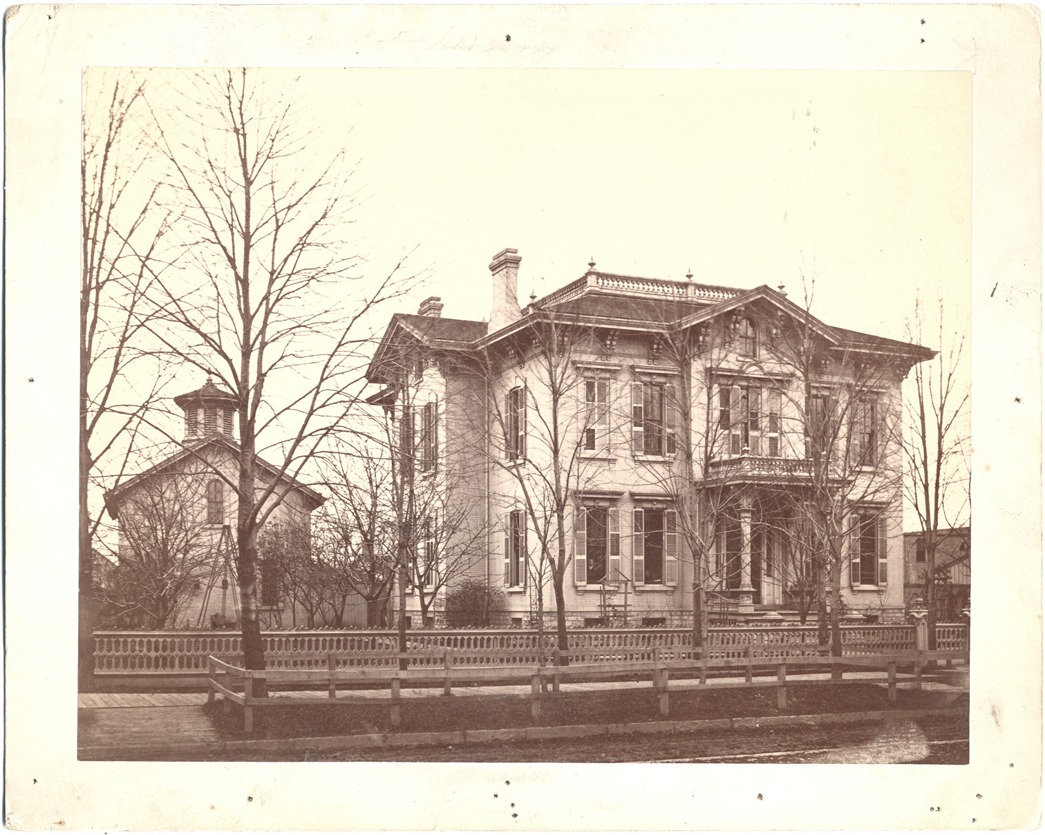 Brick Second Empire house with balustraded roof, viewed at an angle from street, behind decorative metal fence. Leafless trees; carriage house with cupola behind. Stamped on mat back: "Farmer Bros., photographers, Detroit, Mich." Handwritten on mat back: "Emily Ward. 807 Fort St. W. (now no. 2731), 1881."