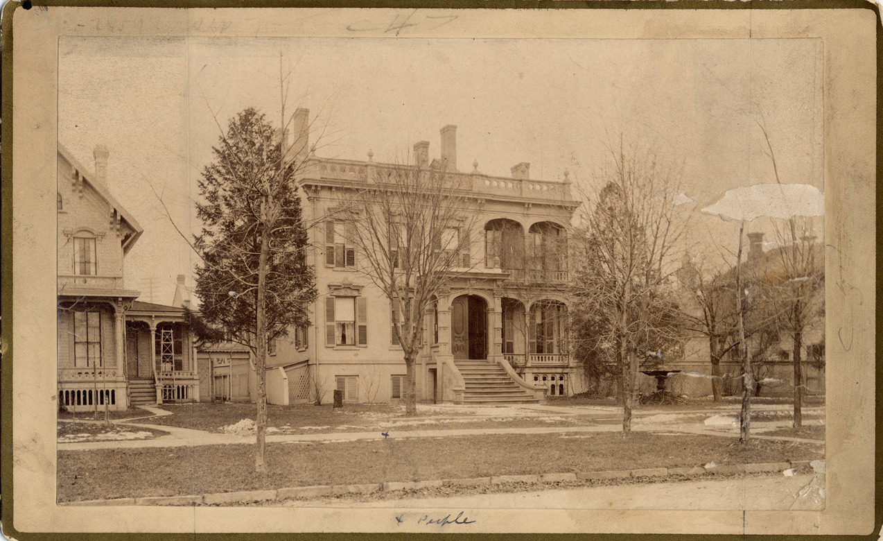 Brick Italianate building with basement, viewed from street. Stairs to porticoed entry; balustraded porches upper and lower levels; balustraded roof. Leafless trees and evergreens; some snow; houses both sides. Handwritten on card back: "Waterman, Joshua W., 50 Washington Ave., 1881. Razed Oct. 29, 1915. Site of Bird store."