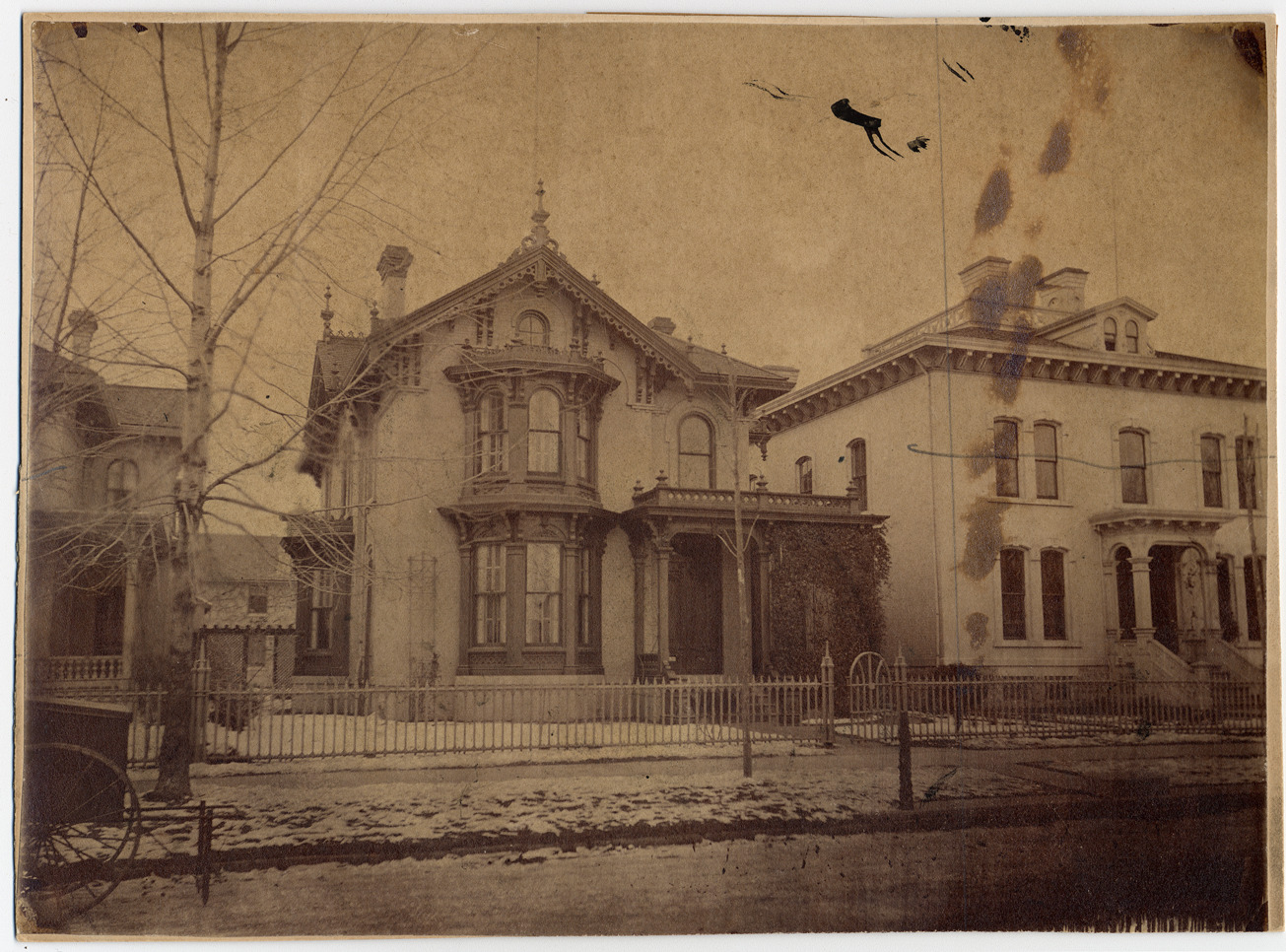 Favorite this☆ Henry Kirke White residence Description: Second Empire house viewed across street and past leafless trees and metal fence. House has bay windows; porch; tall chimneys; decorated gables. Snow on ground; cart by curb. Other houses visible. Handwritten on mat back: "37 High St. E., 1881." Details Resource ID: DPA2961 Subject: White family--Homes and haunts--Michigan--Detroit Dwellings--Michigan--Detroit Architecture, Victorian--Michigan--Detroit Albumen prints Photographic prints Date Issued: 1881 Format: 1 photographic print mounted on mat board ; image 6.25 x 8.5 in. Member of: Burton Historical Collection Filing Location: D/Historic houses-White, Henry Kirke Rights: Physical rights are retained by DPL. Copyright is retained in accordance with U.S. copyright laws.