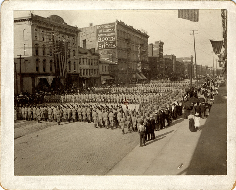 Soldiers from the 35th Michigan Volunteer Infantry marching in formation during parade. Spectators line street decorated with flags; sign painted on building reads: "H.S. Robinson and Company, manufacturers boots and shoes." Handwritten on back: "35th Mich. Vol. Aug. 25, 1898."