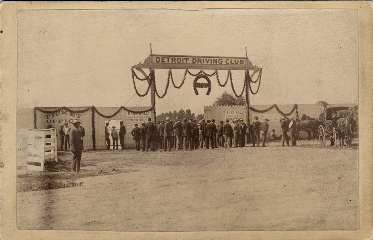 Entrance to Detroit Driving Club. Large crowd of men in suits and wide-brimmed hats gather around entrance, horses and carriages on right side of photo. Wooden fence has several signs, reading "Ticket office," and "Baseball League Championship Games, Recreation Park." Sign above entrance reads "Detroit Driving Club," with a decorative horseshoe below reading "Welcome." Printed on back: "Photographic sketches, in and about the city of Detroit, consisting of street and marine views, public buildings, churches, monumental, and other objects of interest. Photographed and published by Jex Bardwell."