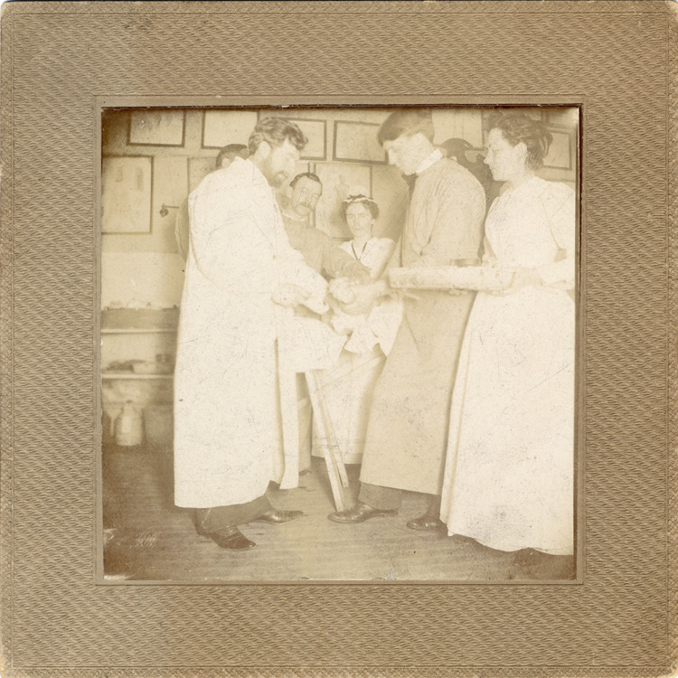 Group of nurses and doctors at Detroit Emergency Hospital. Nurses sit in front, wearing white dresses and caps with aprons tied in front. Doctors stand in back, wearing coats over dark suits. Background wall shows portraits of 1897 faculty from Michigan College of Medicine and Surgery. Handwritten over second figure from right: "W.J. Stapleton." Handwritten on back: "Detroit Emergency Hospital, March 18-99."
