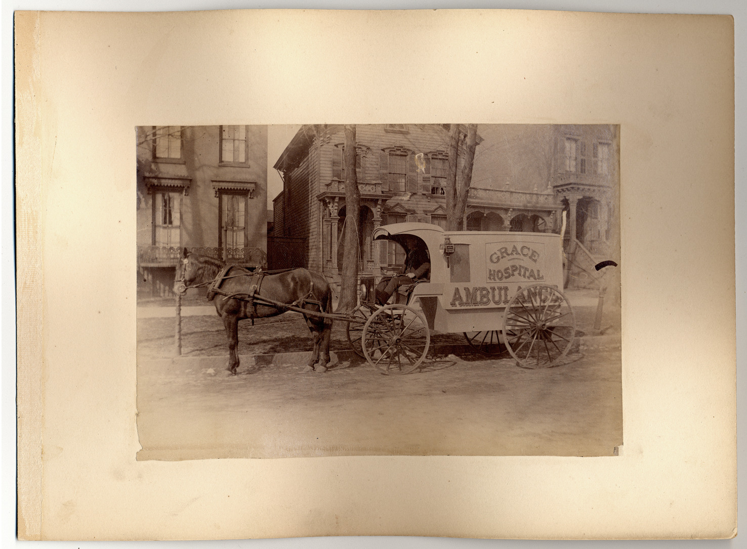 Favorite this☆ Horse-drawn ambulance for Grace Hospital Description: Grace Hospital Ambulance. Large horse-drawn carriage with "Grace Hospital ambulance" painted on side. Driver sits in front. Lamp affixed to front side of carriage. Residential neighborhood in background. Details Resource ID: DPA3018 Subject: Ambulances--Michigan--Detroit Horse-drawn vehicles--Michigan--Detroit Grace Hospital (Detroit, Mich.) Photographic prints Date Issued: Unknown year Format: 1 photographic print mounted on mat board ; image 4.5 x 6.25 in. Member of: Burton Historical Collection Filing Location: D/Hospitals-Grace Rights: Physical rights are retained by DPL. Copyright is retained in accordance with U.S. copyright laws.