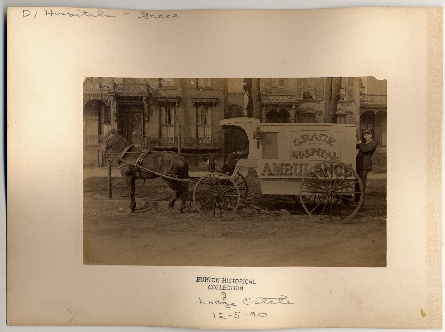 Grace Hospital ambulance. Large horse-drawn carriage with "Grace Hospital Ambulance" painted on side. Driver sits in front and another man rides on step in back of ambulance. Lamp affixed to front side of carriage. Residential neighborhood in background.