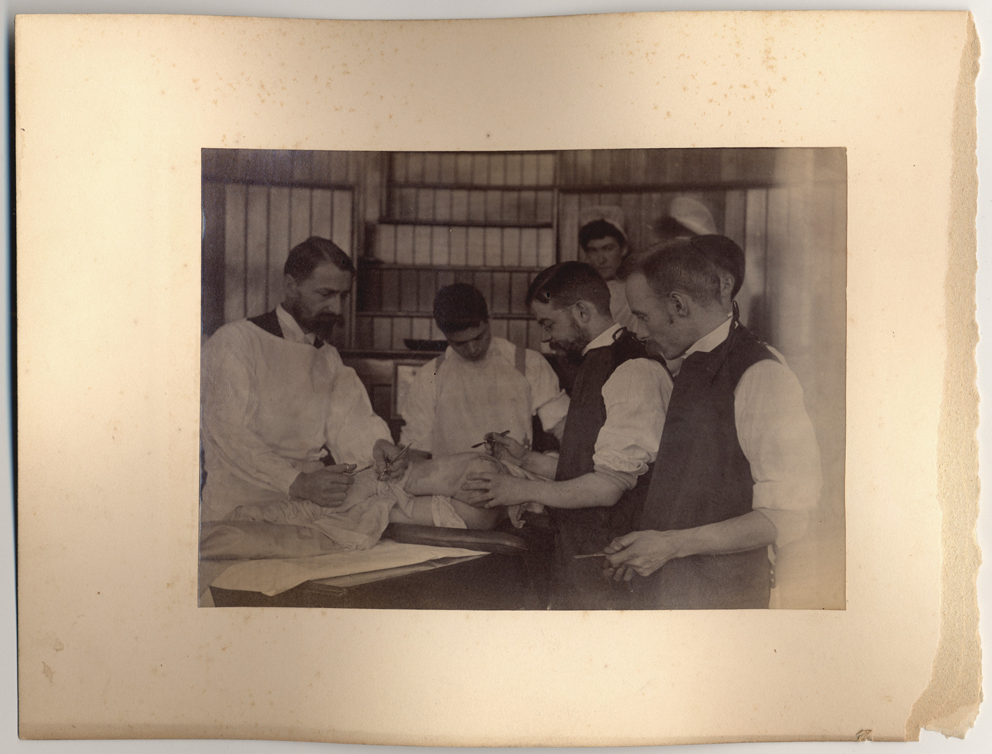 Favorite this☆ Surgery at Grace Hospital Description: Doctors performing surgery on young child. All wear dark suits with rolled sleeves and long aprons in front. Lower half of young child is exposed on table, appears to be a large cut on their hip. Details Resource ID: DPA3027 Subject: Surgery--Michigan--Detroit Physicians--Michigan--Detroit Grace Hospital (Detroit, Mich.) Photographic prints Date Issued: Unknown year Format: 1 photographic print mounted on mat board ; image 4.5 x 6.5 in. Member of: Burton Historical Collection Filing Location: D/Hospitals-Grace Rights: Physical rights are retained by DPL. Copyright is retained in accordance with U.S. copyright laws.