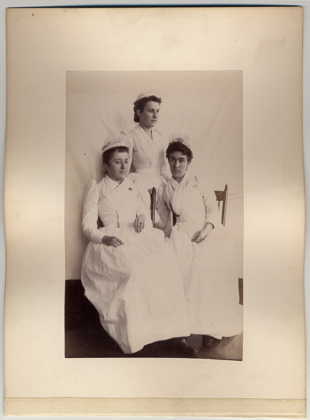 Favorite this☆ Nurses at Grace Hospital Description: Trio of nurses posing at Grace Hospital. All wear white dresses with puffed shoulders and white caps. Details Resource ID: DPA3030 Subject: Nurses--Michigan--Detroit Grace Hospital (Detroit, Mich.) Photographic prints Date Issued: Unknown year Format: 1 photographic print mounted on mat board ; image 6.75 x 4.25 in. Member of: Burton Historical Collection Filing Location: D/Hospitals-Grace Rights: Physical rights are retained by DPL. Copyright is retained in accordance with U.S. copyright laws.