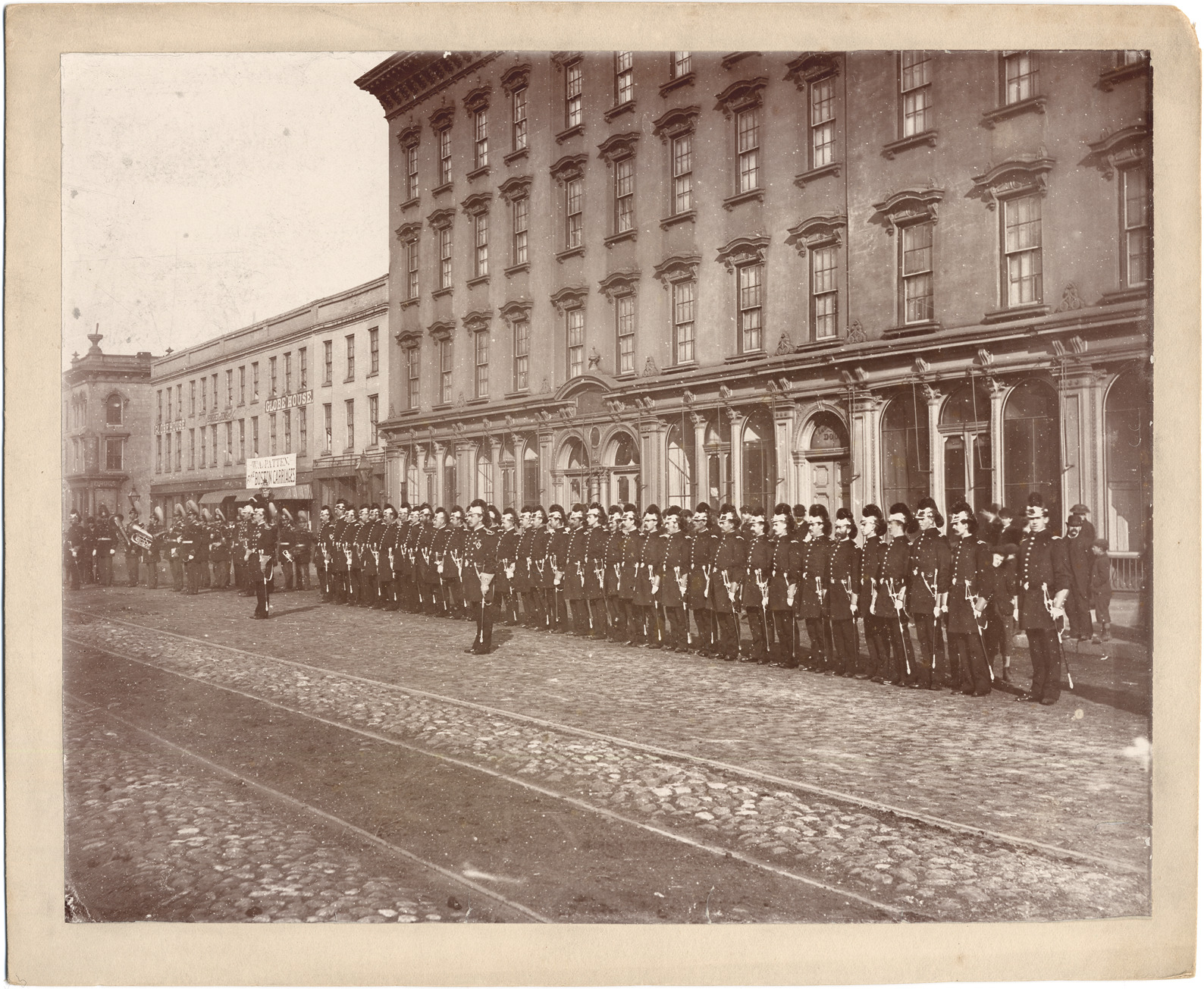 View of Biddle House; line of uniformed military personnel wearing plumed hats and carrying swords stand in front of building; brass band on left; signs on building to left of Biddle House read: "Globe House; W.A. Patten, fine Boston carriages." Handwritten on back: "Biddle House, are these Knights Templar?"