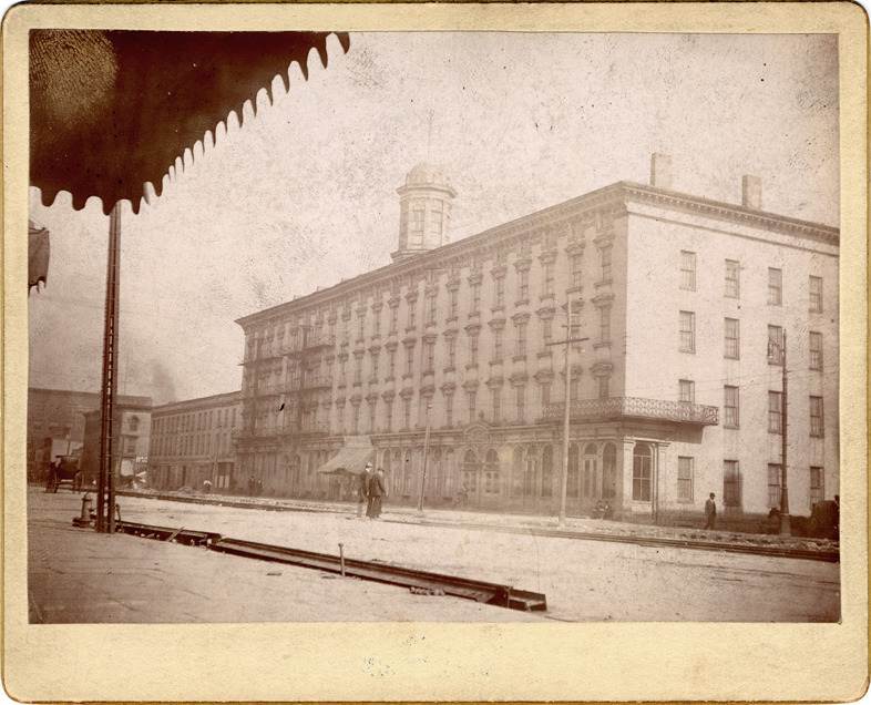 View of Biddle House; two men walk toward building; awning in foreground of photograph. Handwritten on back: "Biddle House, used as High School, Sept. 1895." Label on back: "For duplicates address Ira J. Goodrich, photographer, 139 Lincoln Avenue, Detroit, Mich., no. (in pencil) 83."
