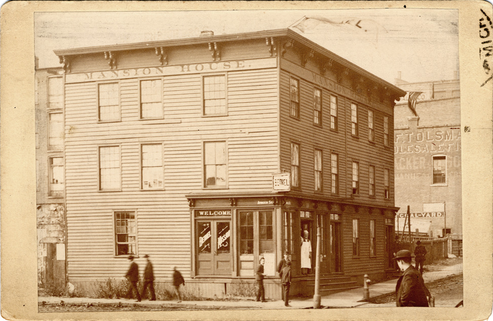 View of Mansion House from corner; Italianate architecture; men walking on sidewalk; man wearing apron stands in doorway. Sign on building: "Bethel." In window: "Welcome, Bethel Mission." Painted on building: "Mansion House." Handwritten on back: "Old Mansion House on Bethel on N.W. cor. Atwater and Griswold, about 1880. Stamped on back: "Hall's Instantaneous Photos, Detroit, Mich." Label on back: "Mansion House. A hotel bearing the name Mansion House, the on the west side of Griswold Street near Atwater, was built and conducted by J. Hanmer, as early as 1837. On February 16, 1840, it was partially destroyed by fire. After being repaired it was kept by B.S. Farnsworth. In March 1849, John Moore became landlord, remaining until 1852. Since then it has frequently changed proprietors. Farmer, Hist. of Detroit, p. 483."