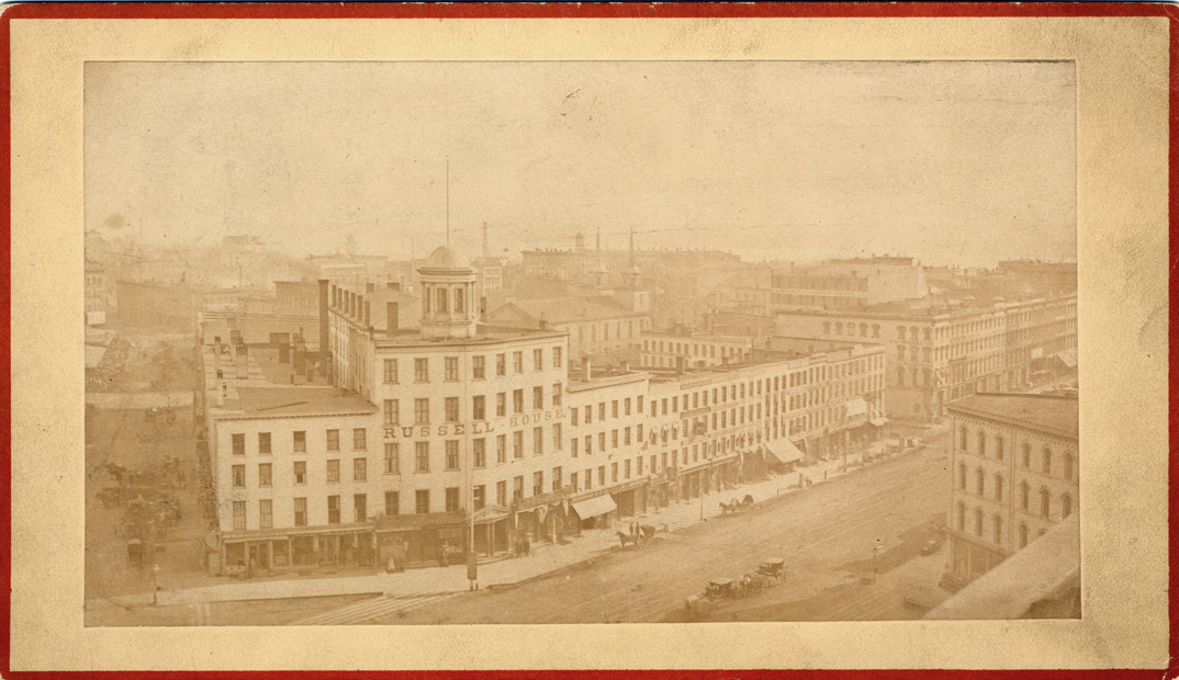 Favorite this☆ Russell House Description: Aerial view of Russell House showing entire city block. Handwritten on back: "East side Woodward Ave. just below Campus Martius, 1871." Details Resource ID: DPA3087 Subject: Hotels--Michigan--Detroit Photographic prints Date Issued: 1871 Format: 1 photographic print mounted on mat board ; image 3.5 x 6 in. Member of: Burton Historical Collection Filing Location: D/Hotels-Russell House Rights: Physical rights are retained by DPL. Copyright is retained in accordance with U.S. copyright laws.