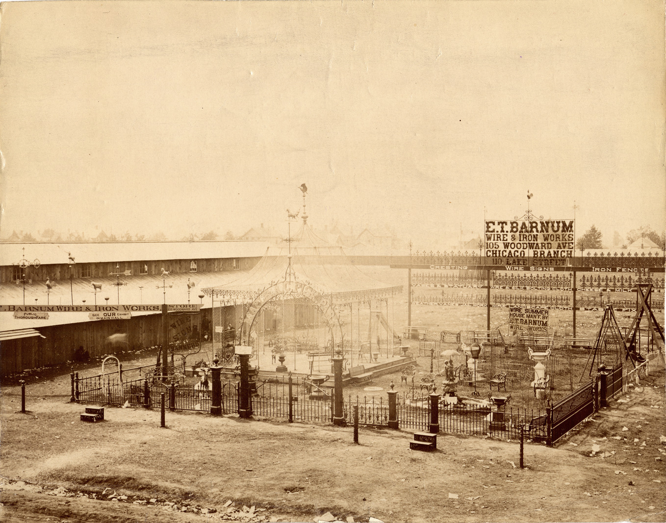 Display from E.T. Barnum Wire & Iron Works. Wrought iron fence surrounds furniture; pavilion, urns; trellises; statuary; weather vanes. Sign over arch reads: "Maple A.C. Fisk Park." Wire sign: "E.T. Barnum Wire & Iron Works, 105 Woodward Ave., Chicago Branch, 100 Lake Street, cresting, wire signs, iron fences, vases & statuary, wire & silk bolting cloth; cheese & milk (?), weather vanes, jail work, wire landscape cloth, stable fixtures." Sign at left: "Public thoroughfare, see our exhibit in Main Hall." Handwritten on back: "State Fair exhibit on site of Ford Highland Pk. Plant." Stamped on back: "Earle & Hawley, commercial photographers, 16 & 18 Clifford Street, Detroit, Mich."