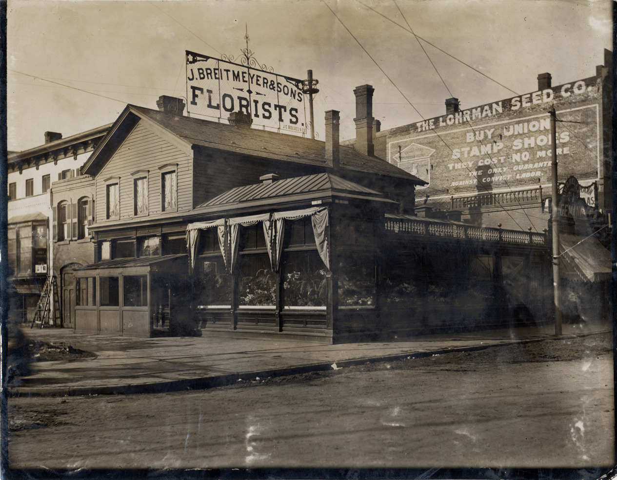 Wooden-frame building with windows along front and sides of building; flowers and plants visible through windows; wire sign on roof: "J. Breitmeyer & Sons florists." On brick building next door: "The Lohrman Seed Co.; Buy union stamp shoes, they cost no more, the only guarantee against convict labor." Handwritten on back: "Breitmeyer building."