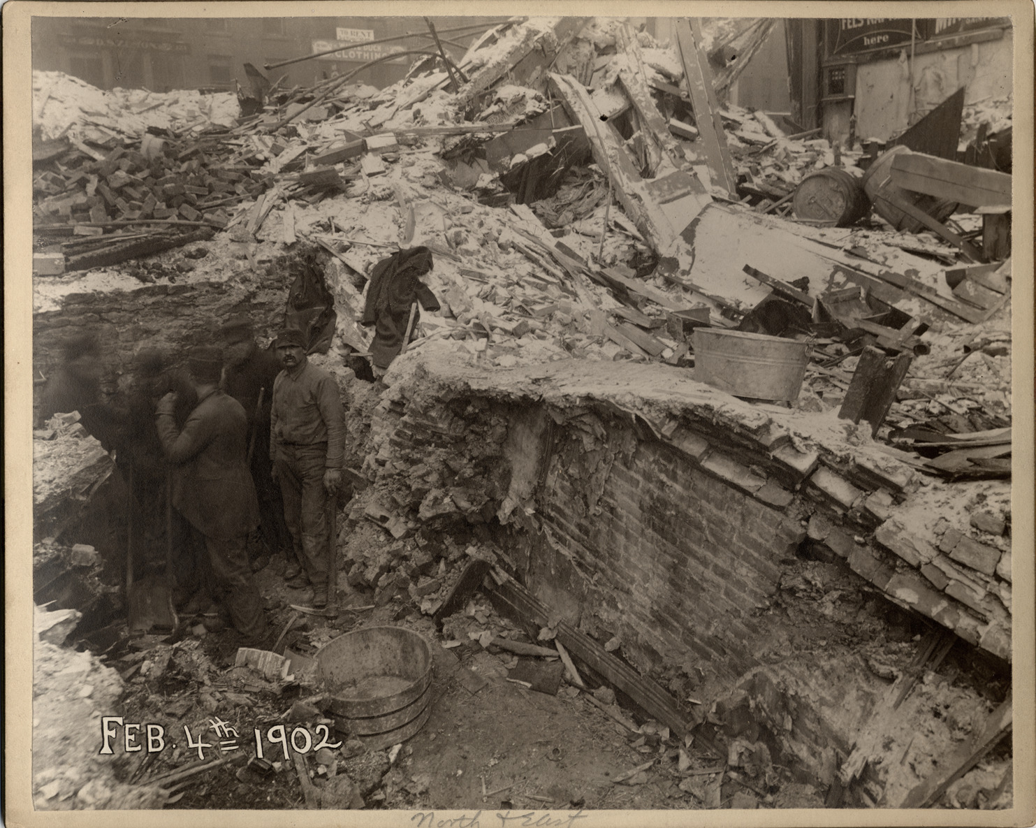 Men clearing pile of rubble from Crusoe Brothers building after January fire; they stand in hole bounded by brick wall. Sign partially visible reads: "Get Fels Naptha here." Written on photograph front: "Feb. 4th 1902." Handwritten on mat front: "North & east." Handwritten on mat back: "16."
