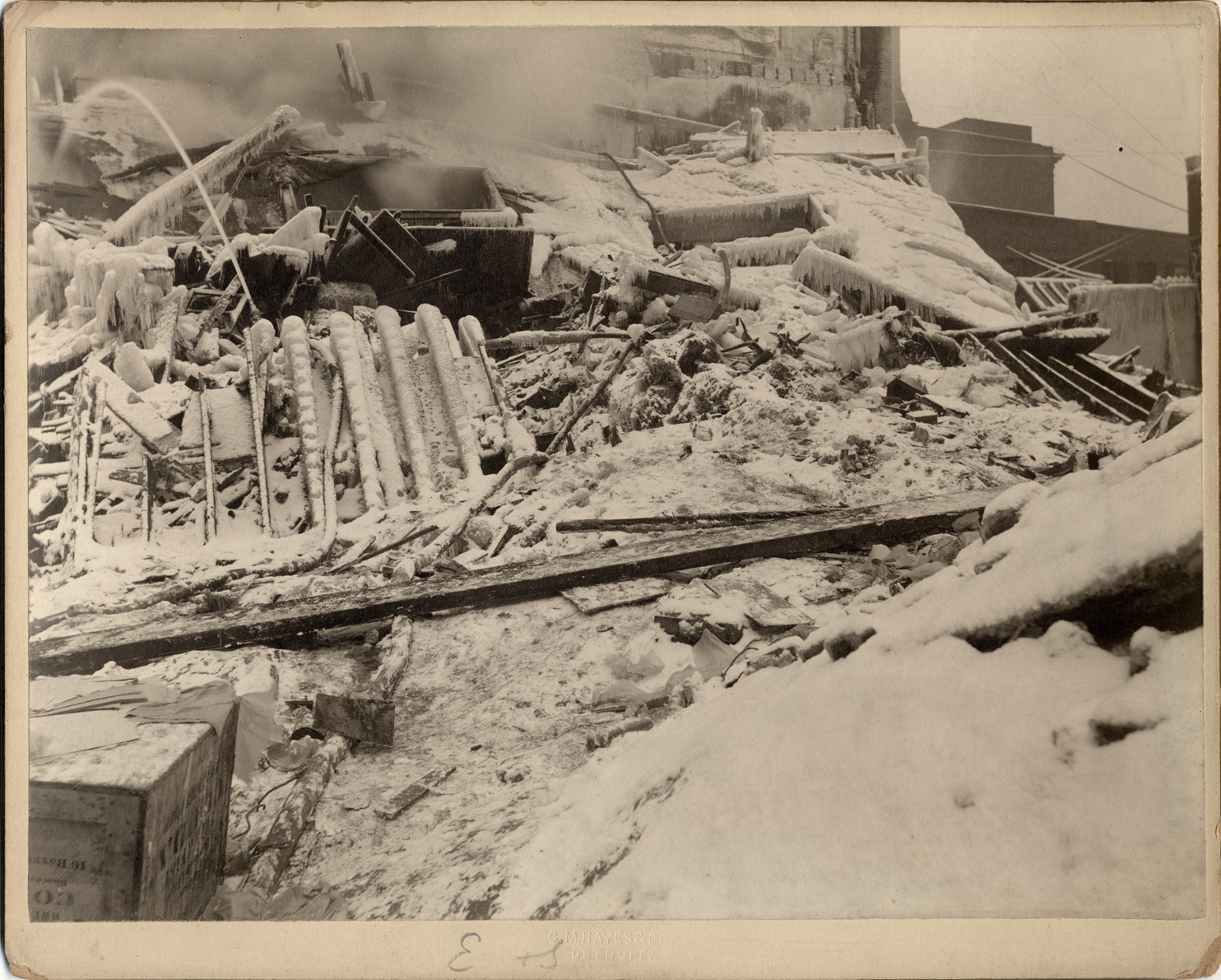 Water sprays onto rubble from Crusoe Brothers building fire; all covered with ice. Upturned wooden box, legend not legible, in foreground with papers on top. Other buildings across street, upper stories just visible. Handwritten on mat front: "E. & S." Handwritten on mat back: "3. Jan 24/02."
