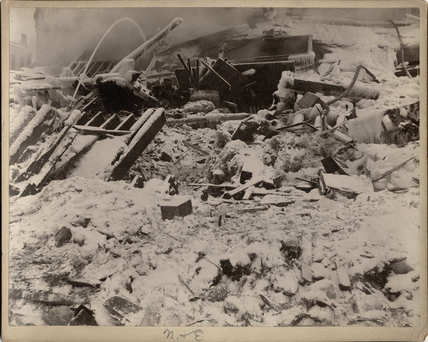 Frozen water on rubble from Crusoe Brothers building fire; hose sprays water in back. Handwritten on mat front: "N. & E." Handwritten on mat back: "9. Jan 24, 1902."