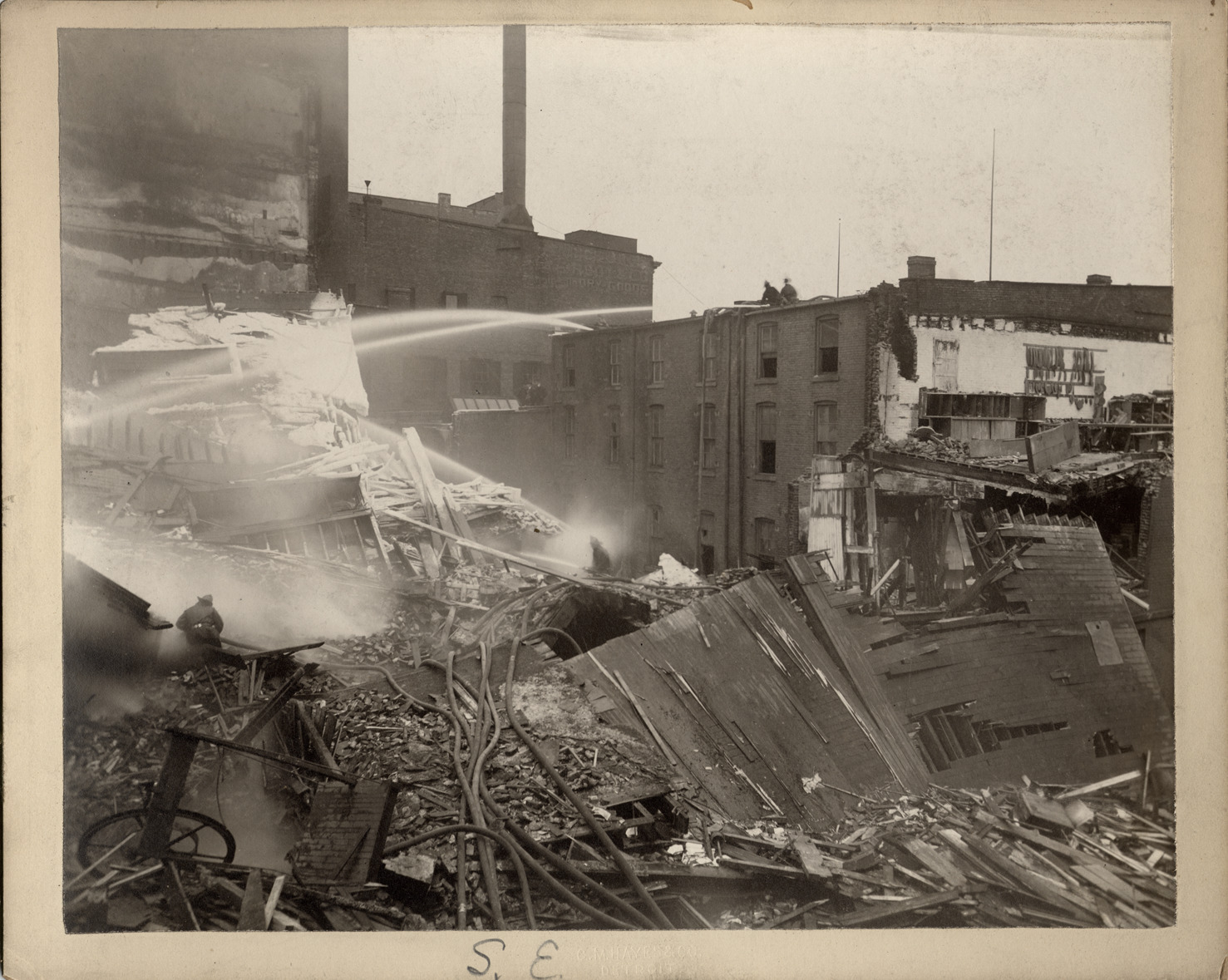 Firemen spray water onto rubble from Crusoe Brothers building fire; much covered with ice. Other buildings across street. Handwritten on mat front: "S.E." Handwritten on mat back: "22. Monday, Jany 20/02."