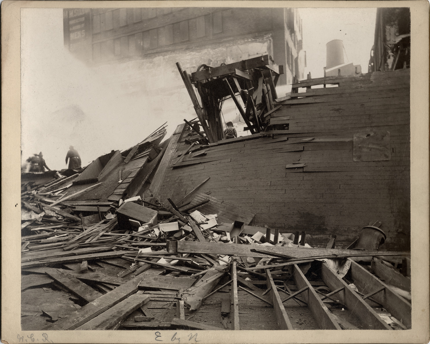 Firemen inside walls inspecting rubble from Crusoe Brothers building fire. Other buildings across street. Handwritten on mat front: "W.C.R. E. by N." Handwritten on mat back: "18. Monday, Jany 20/02."