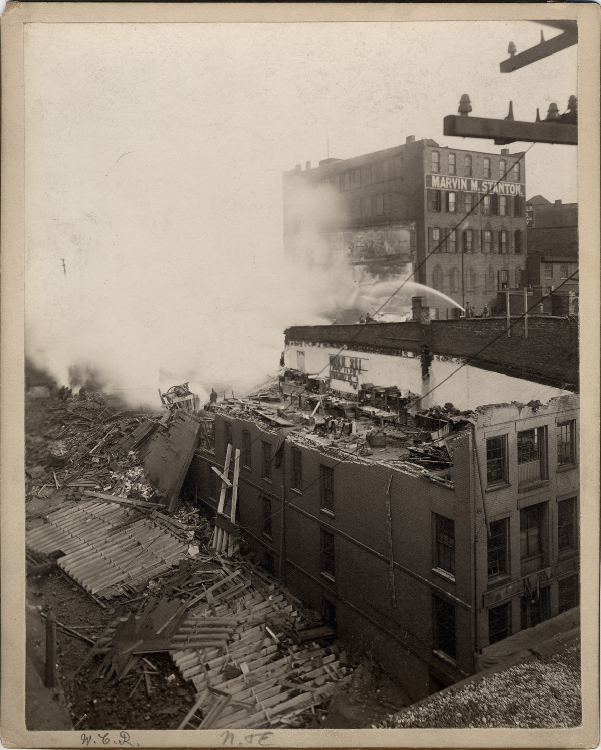 Firemen spray water onto rubble of Crusoe Brothers building fire from roof of neighboring building. Sign on building beyond reads "Marvin M. Stanton." Handwritten on mat front: "W.C.R. N. & E." Handwritten on mat back: "7. Monday, Jany 20/02."