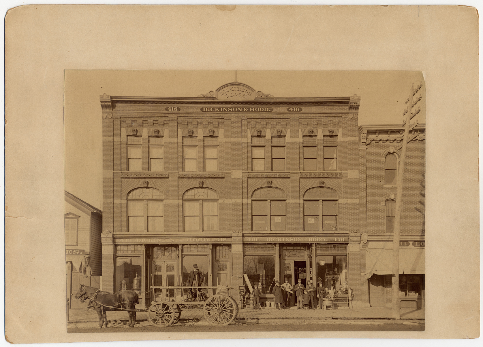 Several men and two children standing by hardware store door; man standing on horse-drawn wagon. Display windows have leaded detail. Building is labeled "Dickinson Block." Address is 416-418 Grand River. Typed on label on mat back: "On wagon: Sam Ford - Redford, Mich. In front of store: John ----, John Toepel - Detroit (dead), Wesley Smith - Detroit, Andrew Tyre - Detroit, M. Wesson Dickinson - Detroit, Horace Hills Dickinson - Detroit (dead), James C. Hood - Detroit. North side of Grand River Ave., between Sixth and South Sts. 1885 [corrected from 1883]." Handwritten on mat back: "Dickinson, Horace Hills, 1853-1920, see Burton, City of Detroit, v.3 p.175." Mat has slight stain and tear; corners worn.