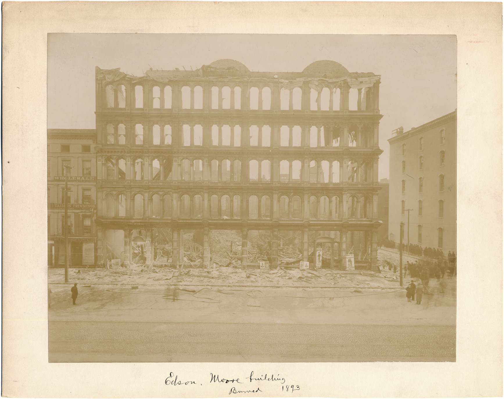 Crowd looking at shell of Edson, Moore building. Hoses still on street. Five-story brick building; wholesale drygoods merchant. Handwritten on mat front: "Edson, Moore Building. Burned 1893." Stamped on mat back: "From Alvord & Co., exclusively commercial photographers, 55 Rowland St., Detroit, Mich. Ground floor." Handwritten on mat back: "16."