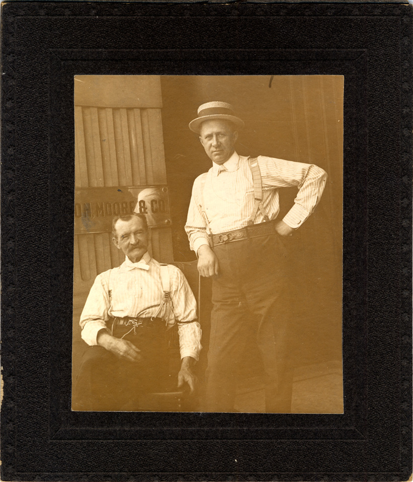 Favorite this☆ Staff of Edson, Moore Description: Two men by entrance to Edson, Moore & Co., marked by brass plate. Both men in striped collared shirts, suspenders, and belts; one man wears straw hat. Details Resource ID: DPA3204 Subject: Distributors (Commerce)--Michigan--Detroit Distributors (Commerce)--Employees Cabinet photographs Albumen prints Photographic prints Date Issued: Unknown year Format: 1 cabinet card ; image 4.5 x 3.75 in. Member of: Burton Historical Collection Filing Location: D/Industries & business houses-Edson, Moore & Co. Rights: Physical rights are retained by DPL. Copyright is retained in accordance with U.S. copyright laws.