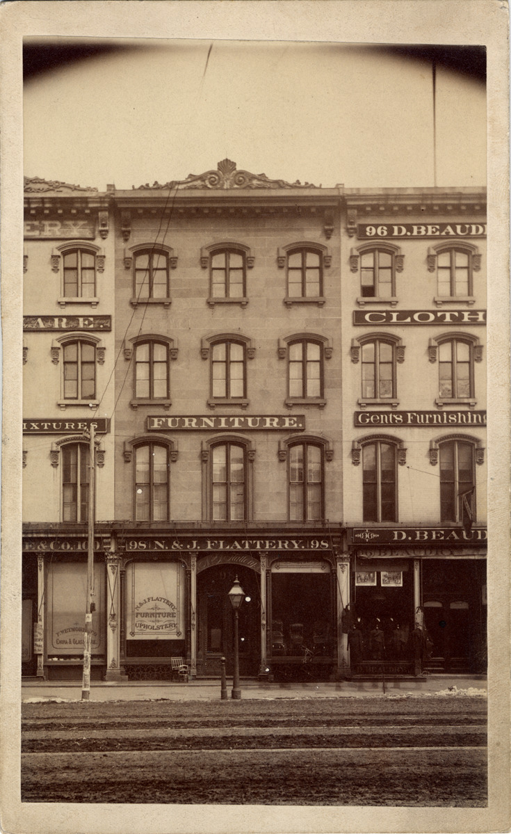 Three brick storefronts built against each other, viewed directly across street. Central business is Flattery's furniture & upholstery; D. Beaudry & Ratzek gent's furnishings and F. Wetmore & Co. china, crockery & glassware on flanks. Stamped on mat back: "Farmer Bros., photographers, Detroit, Mich." Handwritten on mat back: "Woodward (east side) at Congress & Larned, 1883."