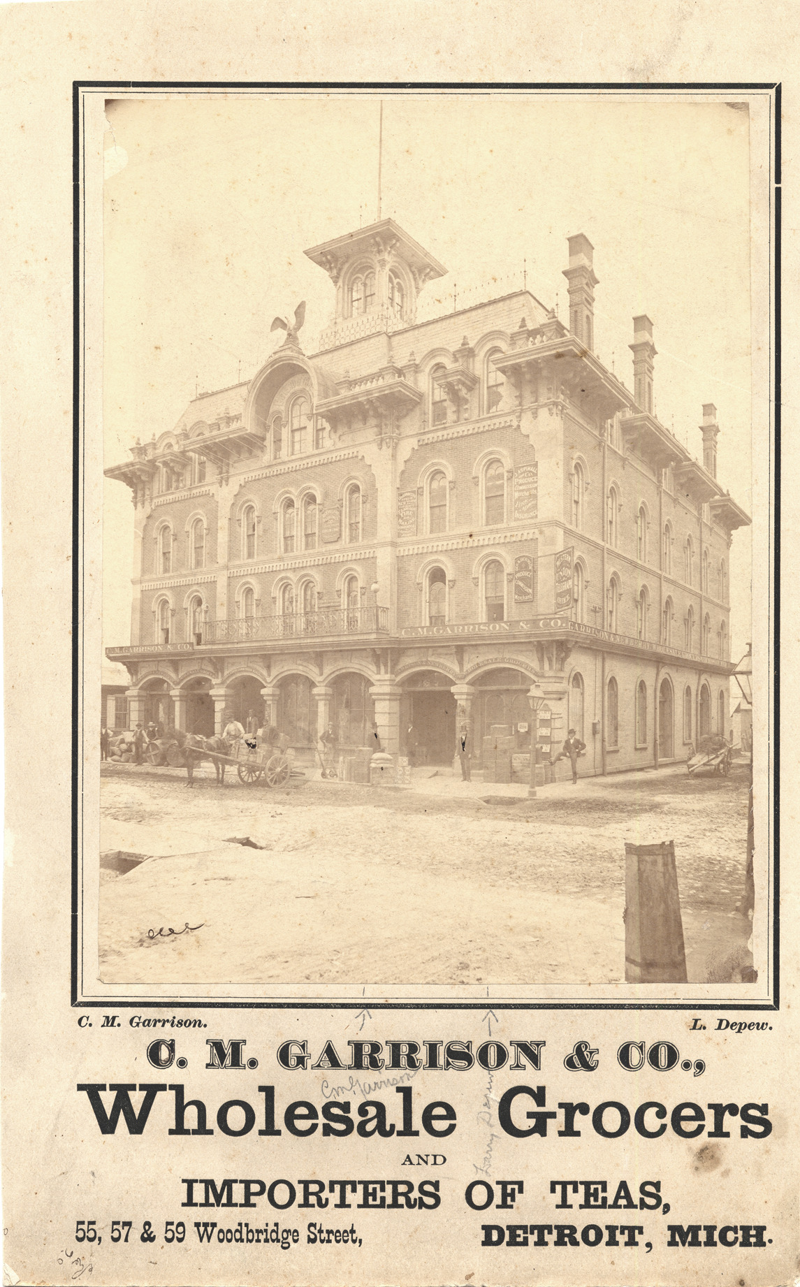 Multistory brick building with cupola; eagle on facade; horse and cart; stacks of sacks and boxes; barrels; several men stand outside business. Handwriting on front with arrows identify two of the men as C.M. Garrison and Larry Depew. Stamped on front under image: C.M. Garrison, L. Depew. Stamped on front: "C.M. Garrison & Co., wholesale grocers and importers of teas, 55, 57 & 59 Woodbridge Street, Detroit, Mich." Handwritten on back: "1724 Seyburn Ave."