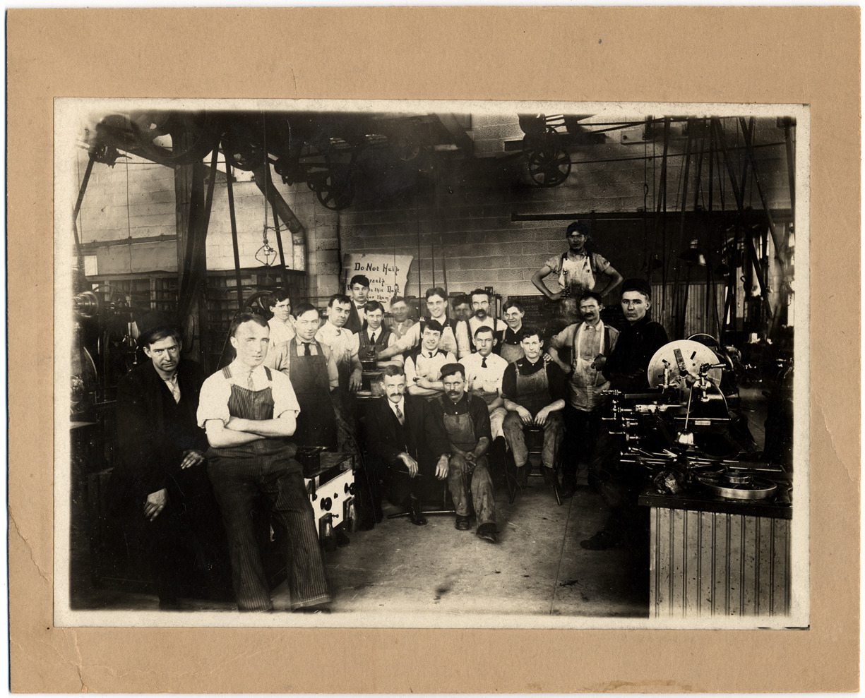Favorite this☆ Interior of Hoskins Manufacturing Co. Description: Group of men, some wearing aprons, pose on factory floor; wheels and pulleys overhead; machinery on table; sign tacked on wall: "Do not help yourself ... " Handwritten on back: "435 Lawton, 1910." Details Resource ID: DPA3233 Subject: Machinery industry--Michigan--Detroit Machinery industry--Employees Photographic prints Date Issued: 1910 Format: 1 photographic print mounted on mat board ; image 5 x 7 in. Member of: Burton Historical Collection Filing Location: D/Industries & business houses-Hoskins Manufacturing Co., Inc. Rights: Physical rights are retained by DPL. Copyright is retained in accordance with U.S. copyright laws.